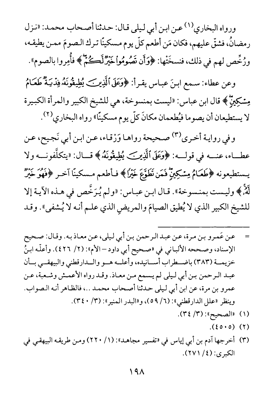 وعن عطاء: سمع ابنَ عباس يقرأ: {وَعَلَى الَّذِينَ يُطِيقُونَهُ فِدْيَةٌ طَعَامُ مِسْكِينٍ} قال ابن عباس: «ليست بمنسوخة، هي للشيخ الكبير والمرأة الكبيرة لا يستطيعان أن يصوما فيُطعمان مكانَ كلّ يوم مسكينًا» رواه البخاري (¬٢).