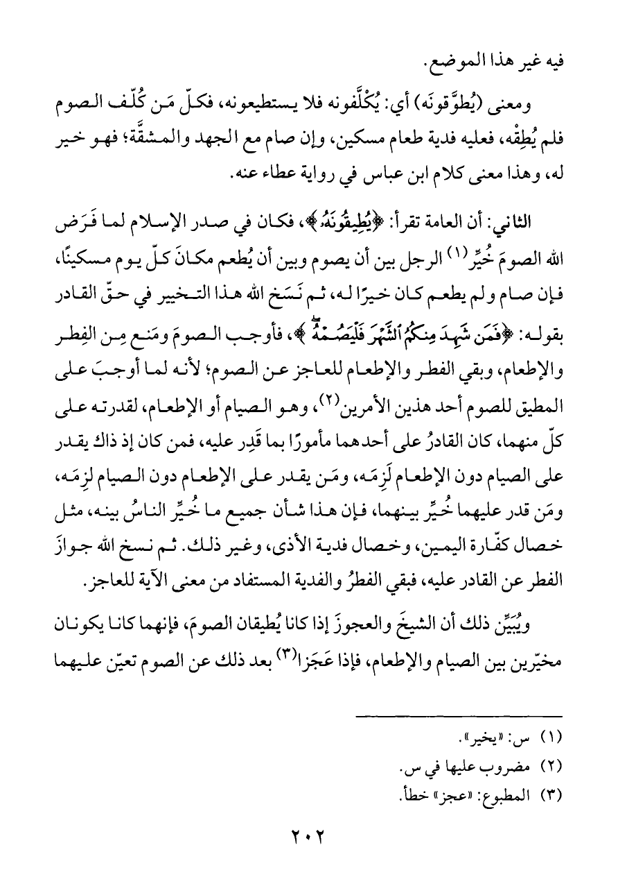 الثاني: أن العامة تقرأ: {يُطِيقُونَهُ}، فكان في صدر الإسلام لما فَرَض الله الصومَ خُيِّر (¬١) الرجل بين أن يصوم وبين أن يُطعم مكانَ كلّ يوم مسكينًا، فإن صام ولم يطعم كان خيرًا له، ثم نَسَخ الله هذا التخيير في حقّ القادر بقوله: {فَمَنْ شَهِدَ مِنْكُمُ الشَّهْرَ فَلْيَصُمْهُ}، فأوجب الصومَ ومَنع مِن الفِطر والإطعام، وبقي الفطر والإطعام للعاجز عن الصوم؛ لأنه لما أوجبَ على المطيق للصوم أحد هذين الأمرين (¬٢)، وهو الصيام أو الإطعام، لقدرته على كلّ منهما، كان القادرُ على أحدهما مأمورًا بما قَدِر عليه، فمن كان إذ ذاك يقدر على الصيام دون الإطعام لَزِمَه، ومَن يقدر على الإطعام دون الصيام لزِمَه، ومَن قدر عليهما خُيِّر بينهما، فإن هذا شأن جميع ما خُيِّر الناسُ بينه، مثل خصال كفّارة اليمين، وخصال فدية الأذى، وغير ذلك. ثم نسخ الله جوازَ الفطر عن القادر عليه، فبقي الفطرُ والفدية المستفاد من معنى الآية للعاجز.