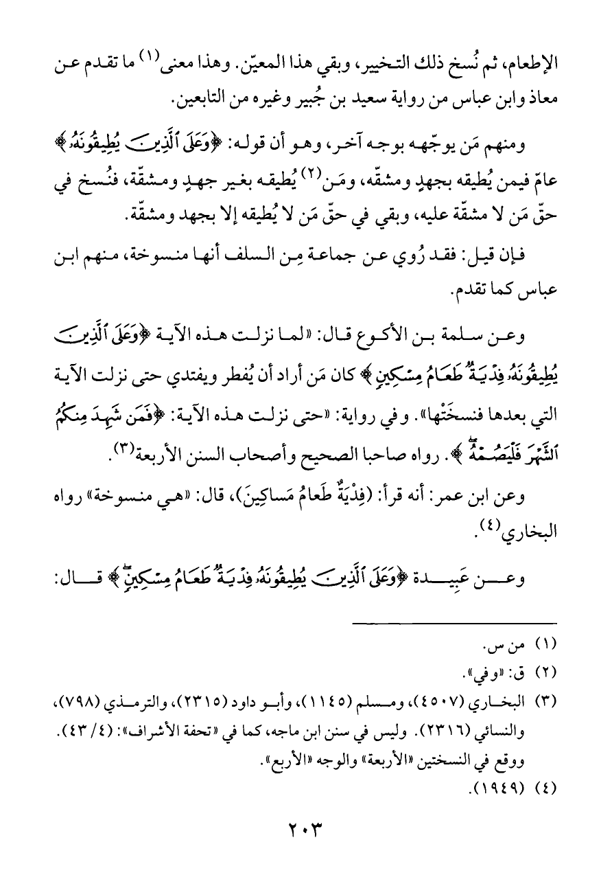 وعن سلمة بن الأكوع قال: «لما نزلت هذه الآية {وَعَلَى الَّذِينَ يُطِيقُونَهُ فِدْيَةٌ طَعَامُ مِسْكِينٍ} كان مَن أراد أن يُفطر ويفتدي حتى نزلت الآية التي بعدها فنسخَتْها». وفي رواية: «حتى نزلت هذه الآية: {فَمَنْ شَهِدَ مِنْكُمُ الشَّهْرَ فَلْيَصُمْهُ}. رواه صاحبا الصحيح وأصحاب السنن الأربعة (¬٣).