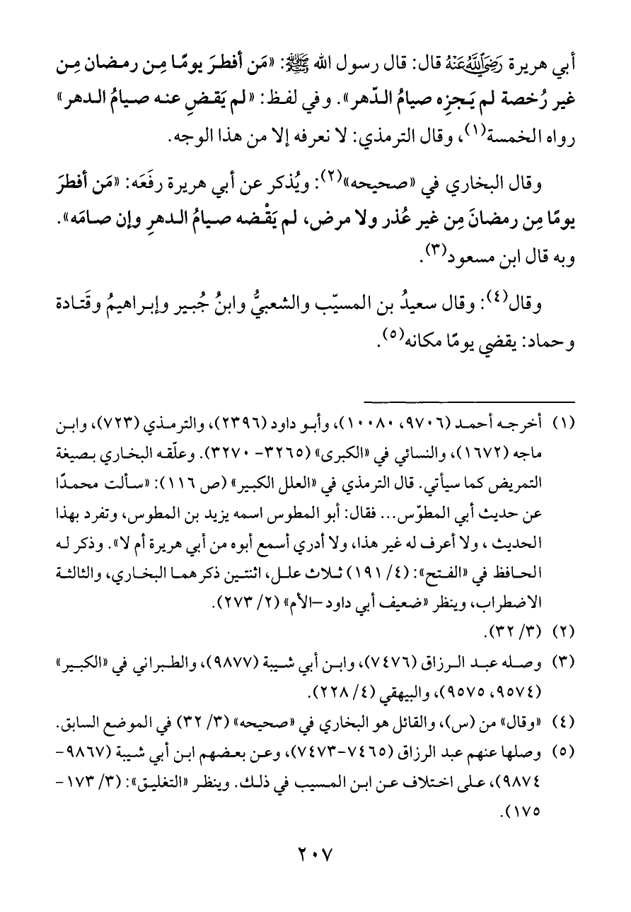 وقال البخاري في «صحيحه» (¬٢): ويُذكر عن أبي هريرة رفَعَه: «مَن أفطرَ يومًا مِن رمضانَ مِن غير عُذر ولا مرض، لم يَقْضه صيامُ الدهرِ وإن صامَه». وبه قال ابن مسعود (¬٣).