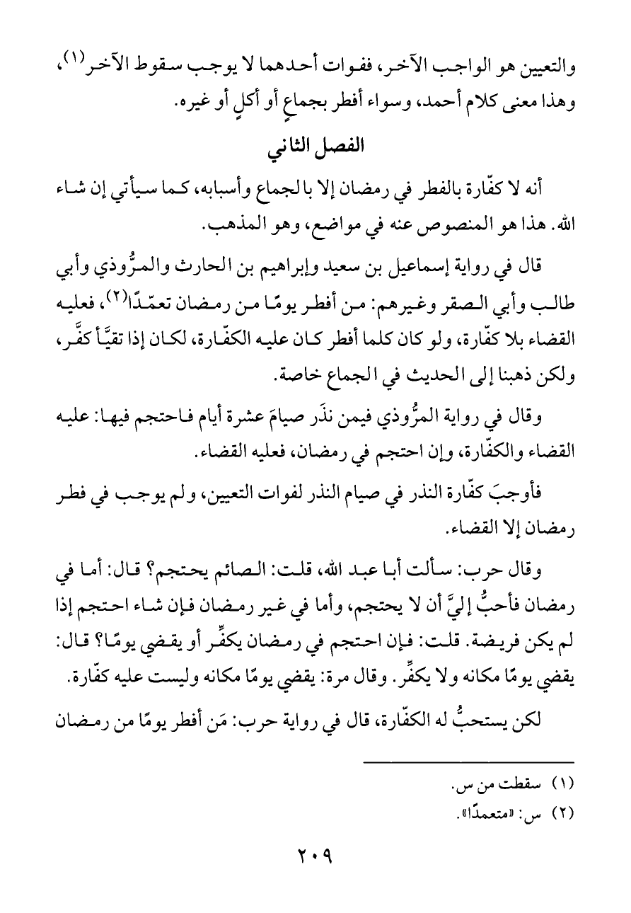قال في رواية إسماعيل بن سعيد وإبراهيم بن الحارث والمرُّوذي وأبي طالب وأبي الصقر وغيرهم: من أفطر يومًا من رمضان تعمّدًا (¬٢)، فعليه القضاء بلا كفّارة، ولو كان كلما أفطر كان عليه الكفّارة، لكان إذا تقيَّأ كفَّر، ولكن ذهبنا إلى الحديث في الجماع خاصة.