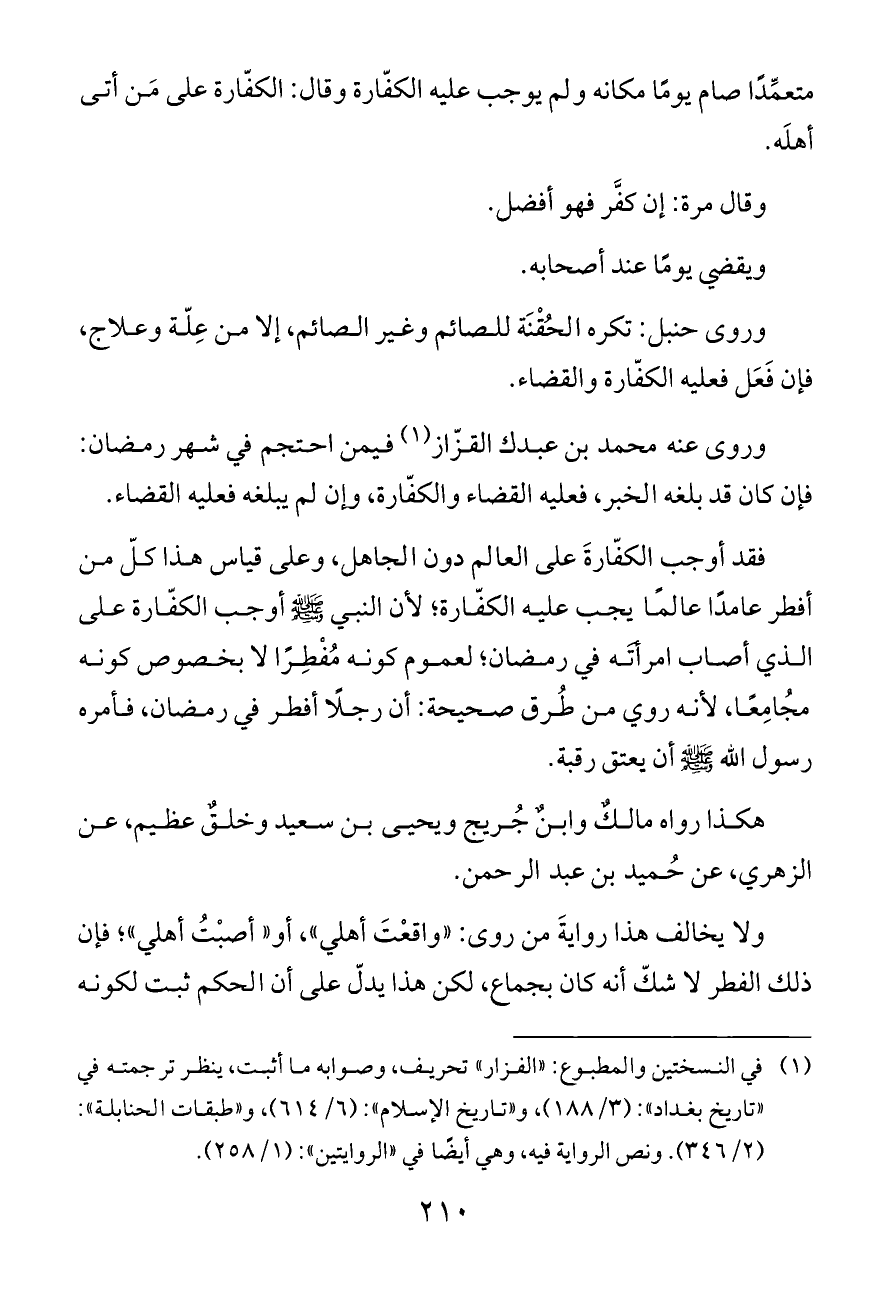 وروى عنه محمد بن عبدك القزّاز (¬١) فيمن احتجم في شهر رمضان: فإن كان قد بلغه الخبر، فعليه القضاء والكفّارة، وإن لم يبلغه فعليه القضاء.