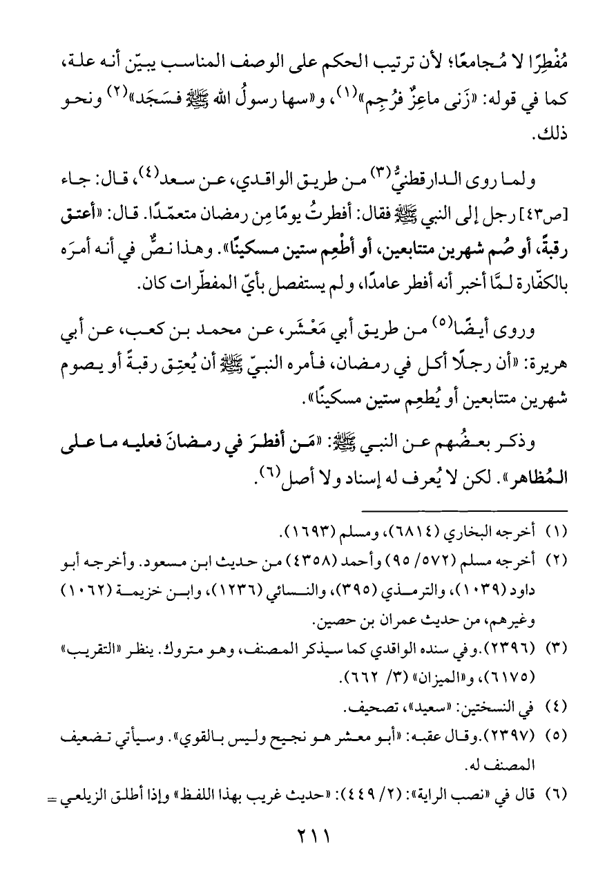 ولما روى الدارقطنيُّ (¬٣) من طريق الواقدي، عن سعد (¬٤)، قال: جاء [ص ٤٣] رجل إلى النبي - صلى الله عليه وسلم - فقال: أفطرتُ يومًا مِن رمضان متعمّدًا. قال: «أعتق رقبةً، أو صُم شهرين متتابعين، أو أطْعِم ستين مسكينًا». وهذا نصٌّ في أنه أمرَه بالكفّارة لمَّا أخبر أنه أفطر عامدًا، ولم يستفصل بأيّ المفطّرات كان.
