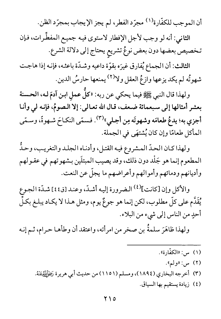 الثاني: أنه لو وجب لأجل الإفطار لاستوى فيه جميع المفطِّرات، فإن تخصيص بعضها دون بعض نوعُ تشريعٍ يحتاج إلى دلالة الشرع.