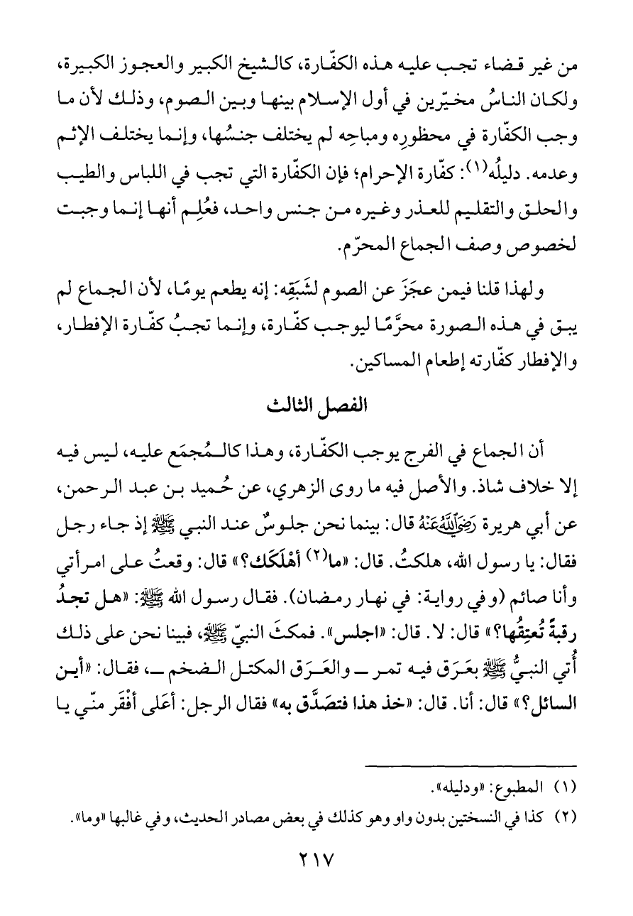 أن الجماع في الفرج يوجب الكفّارة، وهذا كالمُجمَع عليه، ليس فيه إلا خلاف شاذ. والأصل فيه ما روى الزهري، عن حُميد بن عبد الرحمن، عن أبي هريرة - رضي الله عنه - قال: بينما نحن جلوسٌ عند النبي - صلى الله عليه وسلم - إذ جاء رجل فقال: يا رسول الله، هلكتُ. قال: «ما (¬٢) أهْلَكَك؟» قال: وقعتُ على امرأتي وأنا صائم (وفي رواية: في نهار رمضان). فقال رسول الله - صلى الله عليه وسلم -: «هل تجدُ رقبةً تُعتِقُها؟» قال: لا. قال: «اجلس». فمكثَ النبيّ - صلى الله عليه وسلم -، فبينا نحن على ذلك أُتي النبيُّ - صلى الله عليه وسلم - بعَرَق فيه تمر ــ والعَرَق المكتل الضخم ــ، فقال: «أين السائل؟» قال: أنا. قال: «خذ هذا فتصَدَّق به» فقال الرجل: أعَلى أفْقَر منّي يا