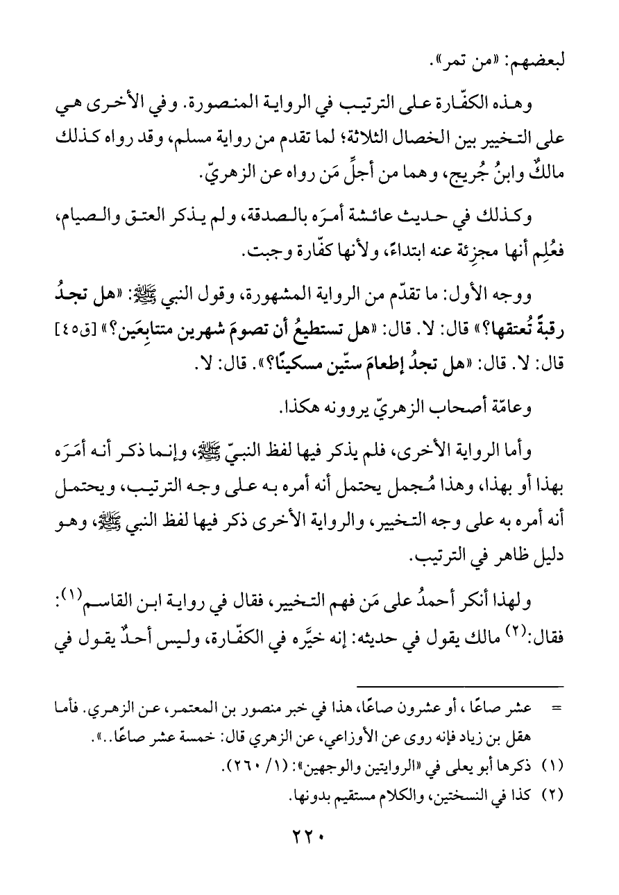 وهذه الكفّارة على الترتيب في الرواية المنصورة. وفي الأخرى هي على التخيير بين الخصال الثلاثة؛ لما تقدم من رواية مسلم، وقد رواه كذلك مالكٌ وابنُ جُريج، وهما من أجلِّ مَن رواه عن الزهريّ.