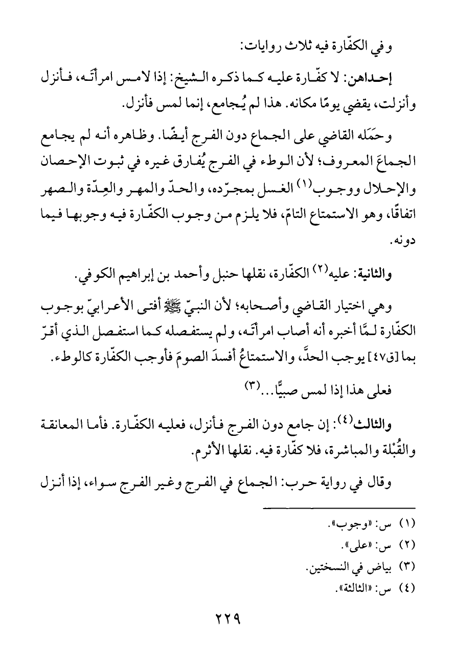والثالث (¬٤): إن جامع دون الفرج فأنزل، فعليه الكفّارة. فأما المعانقة والقُبْلة والمباشرة، فلا كفّارة فيه. نقلها الأثرم.