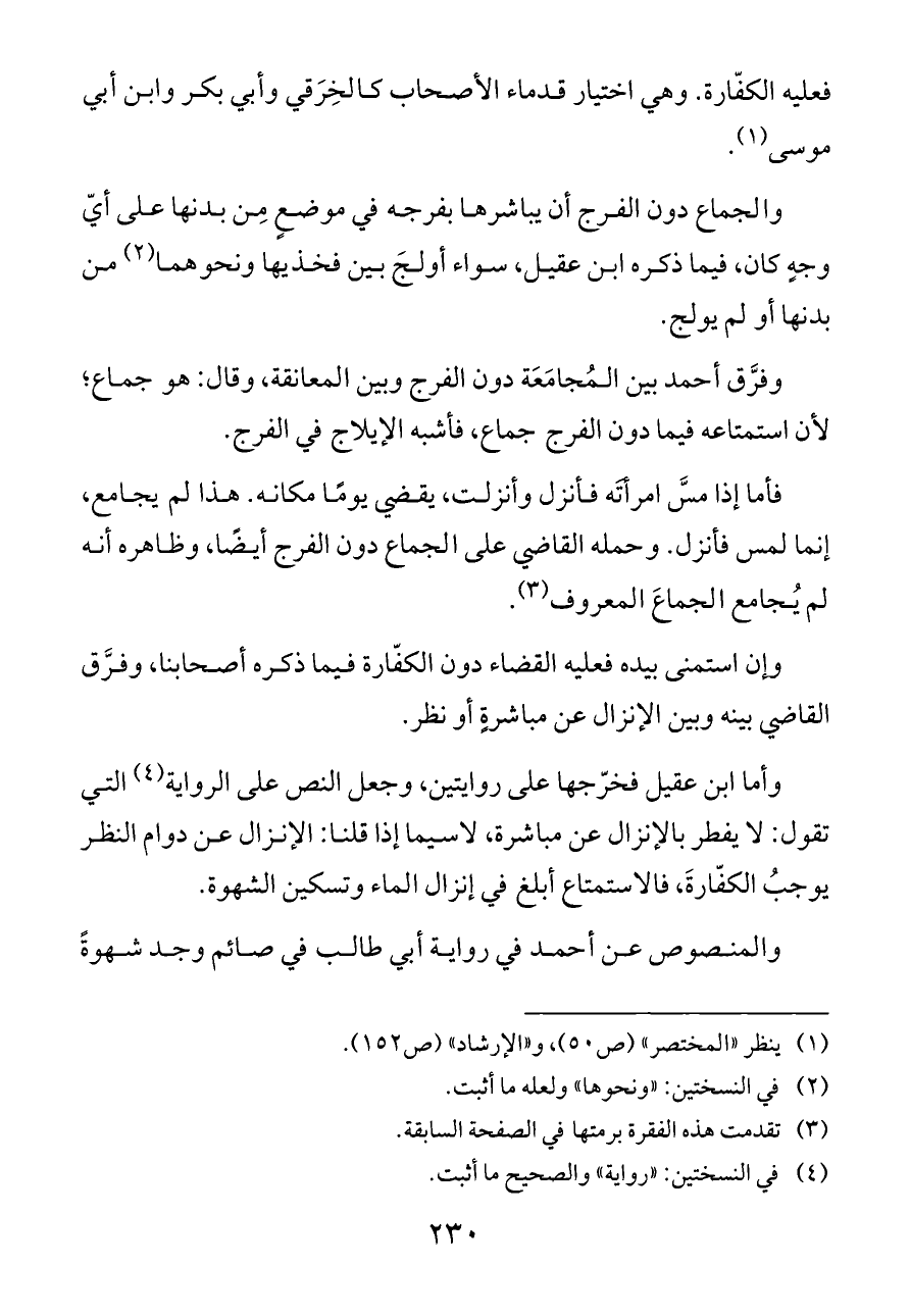 وأما ابن عقيل فخرّجها على روايتين، وجعل النص على الرواية (¬٤) التي تقول: لا يفطر بالإنزال عن مباشرة، لاسيما إذا قلنا: الإنزال عن دوام النظر يوجبُ الكفّارةَ، فالاستمتاع أبلغ في إنزال الماء وتسكين الشهوة.
