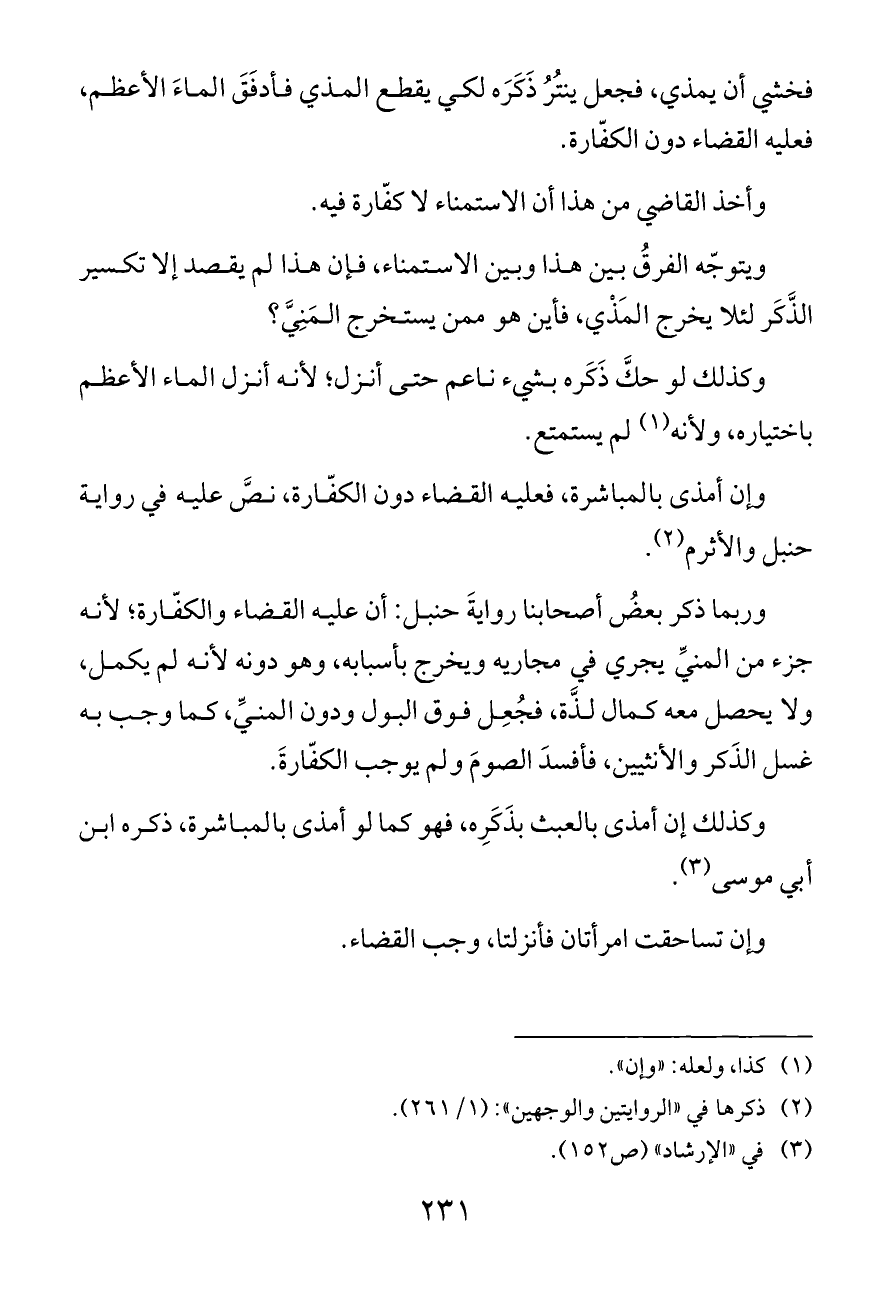 وإن أمذى بالمباشرة، فعليه القضاء دون الكفّارة، نصَّ عليه في رواية حنبل والأثرم (¬٢).