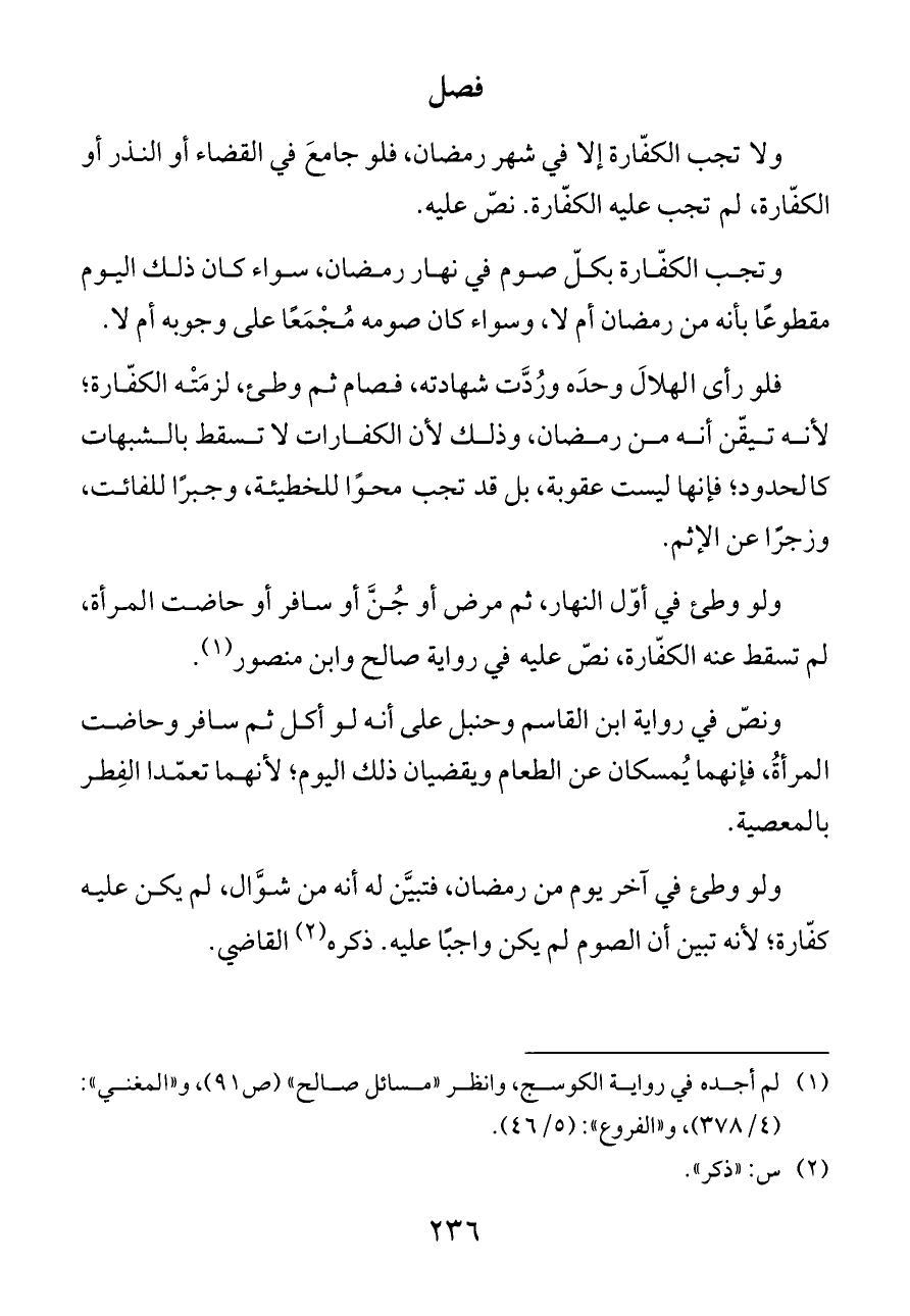 ونصّ في رواية ابن القاسم وحنبل على أنه لو أكل ثم سافر وحاضت المرأةُ، فإنهما يُمسكان عن الطعام ويقضيان ذلك اليوم؛ لأنهما تعمّدا الفِطر بالمعصية.