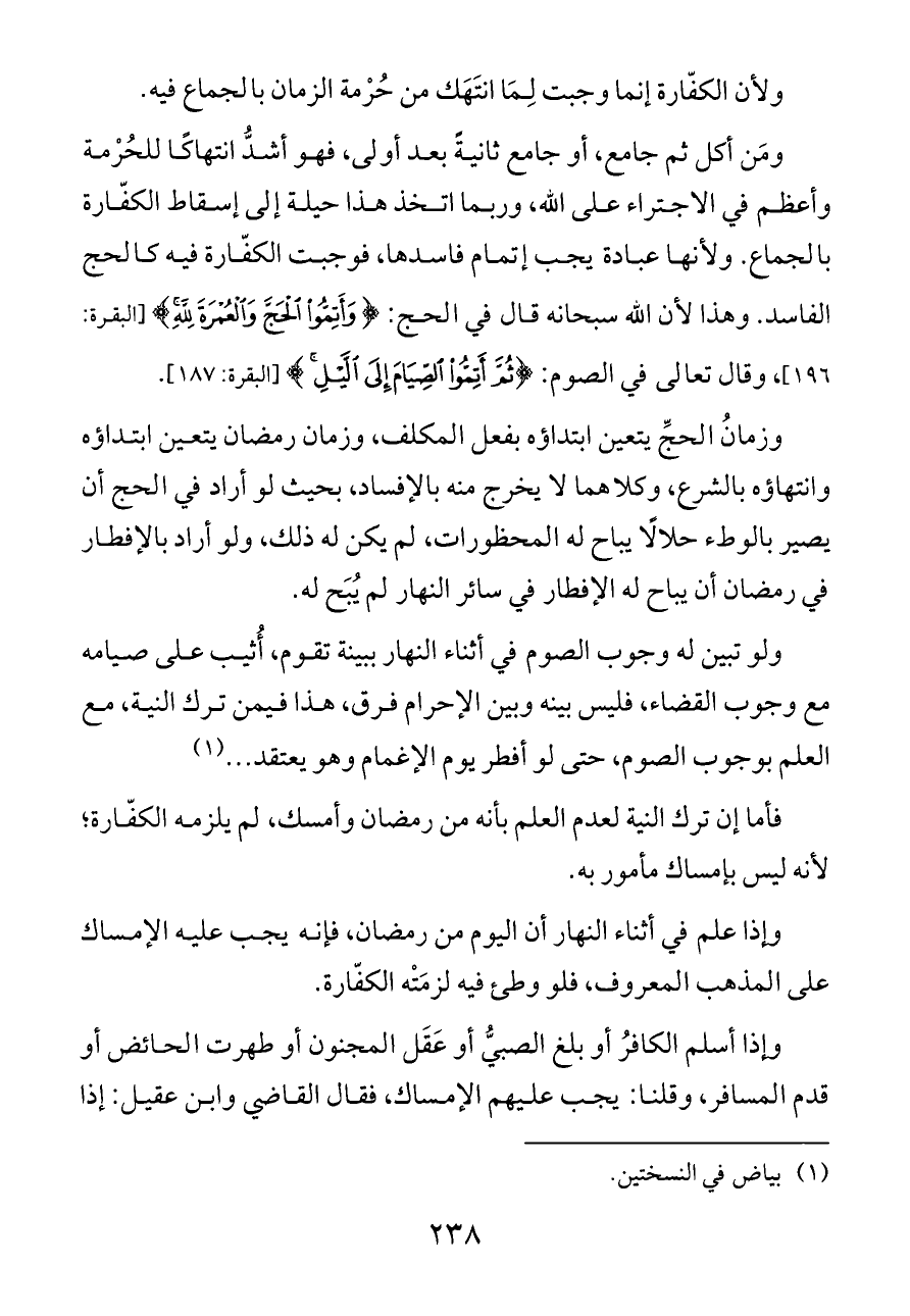 وزمانُ الحجِّ يتعين ابتداؤه بفعل المكلف، وزمان رمضان يتعين ابتداؤه وانتهاؤه بالشرع، وكلاهما لا يخرج منه بالإفساد، بحيث لو أراد في الحج أن يصير بالوطء حلالًا يباح له المحظورات، لم يكن له ذلك، ولو أراد بالإفطار في رمضان أن يباح له الإفطار في سائر النهار لم يُبَح له.