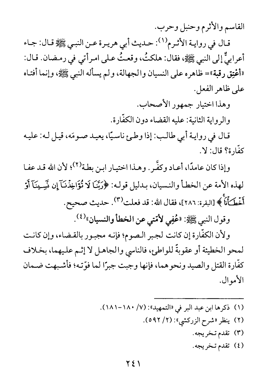 قال في رواية الأثرم (¬١): حديث أبي هريرة عن النبي - صلى الله عليه وسلم - قال: جاء أعرابيٌّ إلى النبي - صلى الله عليه وسلم -، فقال: هلكتُ، وقعتُ على امرأتي في رمضان. قال: «أعْتِق رقبة» = ظاهره على النسيان والجهالة، ولم يسأله النبي - صلى الله عليه وسلم -، وإنما أفتاه على ظاهر الفعل.