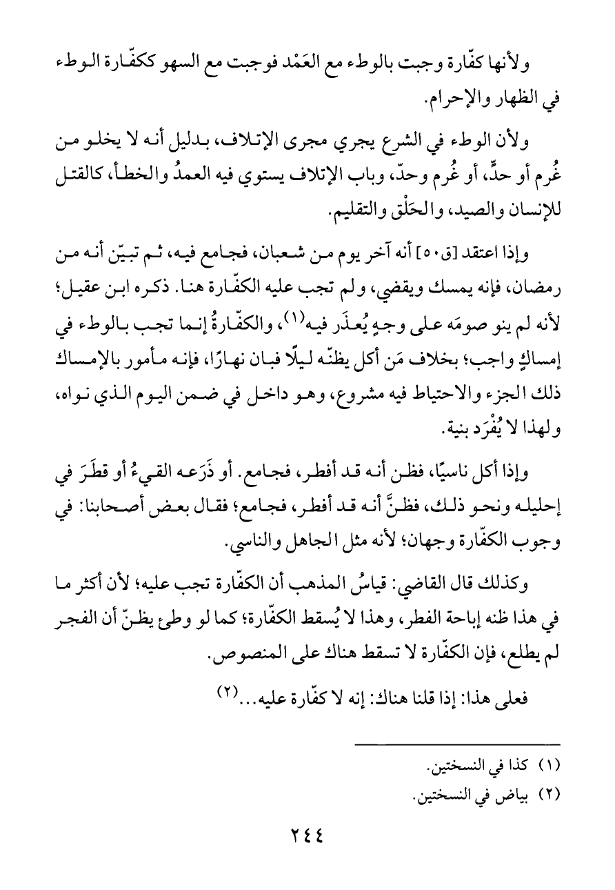 وإذا اعتقد [ق ٥٠] أنه آخر يوم من شعبان، فجامع فيه، ثم تبيّن أنه من رمضان، فإنه يمسك ويقضي، ولم تجب عليه الكفّارة هنا. ذكره ابن عقيل؛ لأنه لم ينو صومَه على وجهٍ يُعذَر فيه (¬١)، والكفّارةُ إنما تجب بالوطء في إمساكٍ واجب؛ بخلاف مَن أكل يظنّه ليلًا فبان نهارًا، فإنه مأمور بالإمساك ذلك الجزء والاحتياط فيه مشروع، وهو داخل في ضمن اليوم الذي نواه، ولهذا لا يُفْرَد بنية.