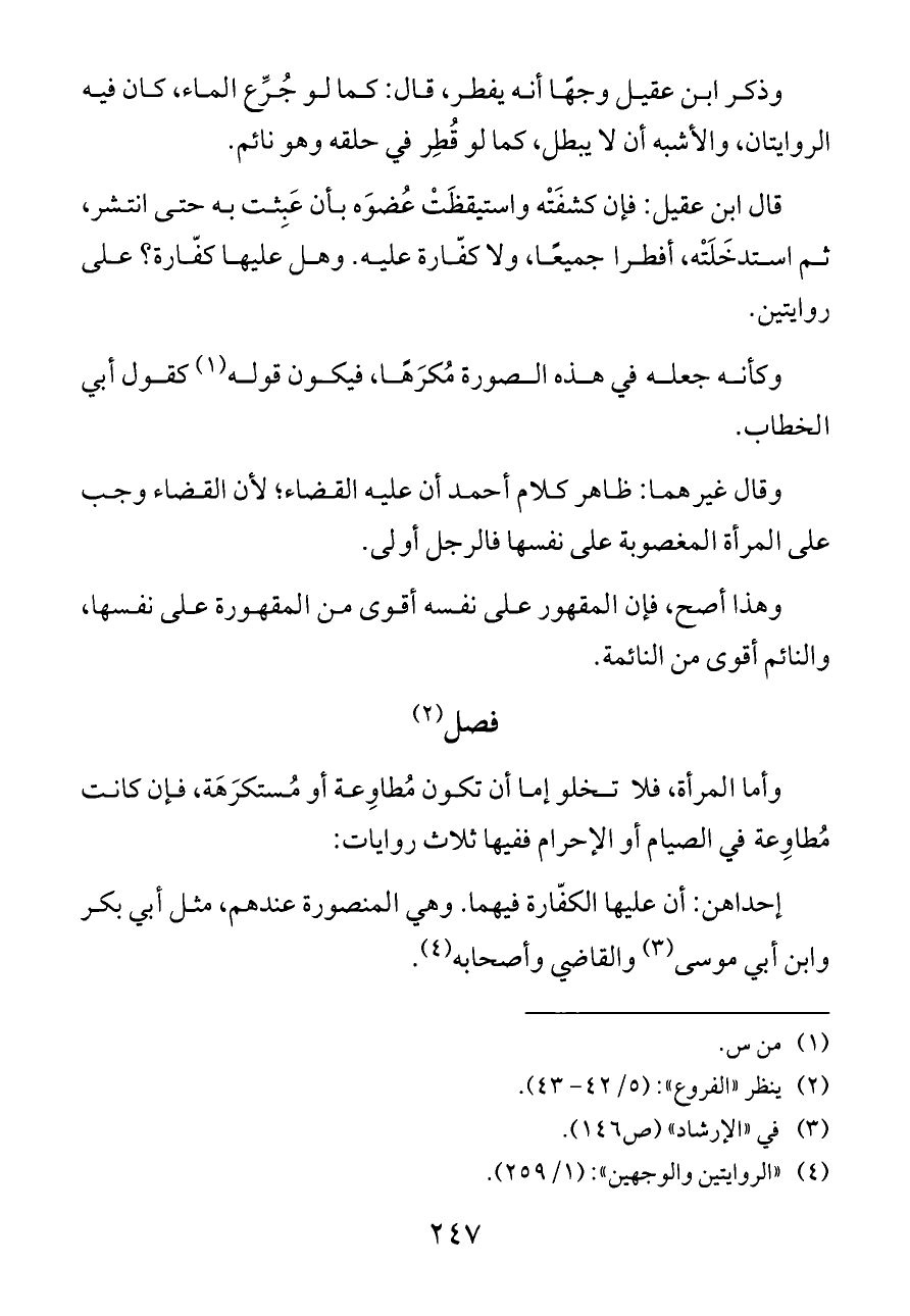 إحداهن: أن عليها الكفّارة فيهما. وهي المنصورة عندهم، مثل أبي بكر وابن أبي موسى (¬٣) والقاضي وأصحابه (¬٤).