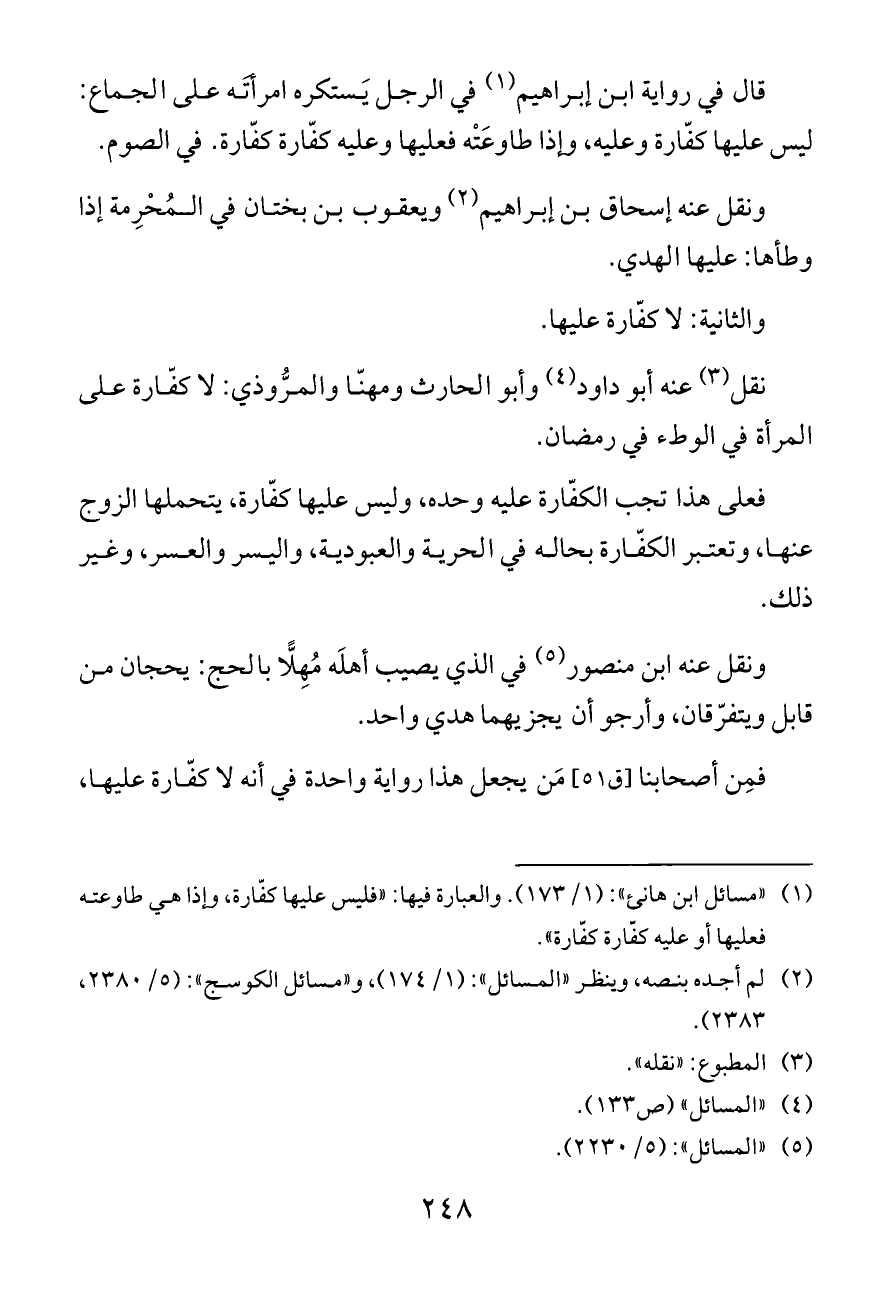 (¬١) «مسائل ابن هانئ»: (١/ ١٧٣). والعبارة فيها: «فليس عليها كفّارة، وإذا هي طاوعته فعليها أو عليه كفّارة كفّارة».