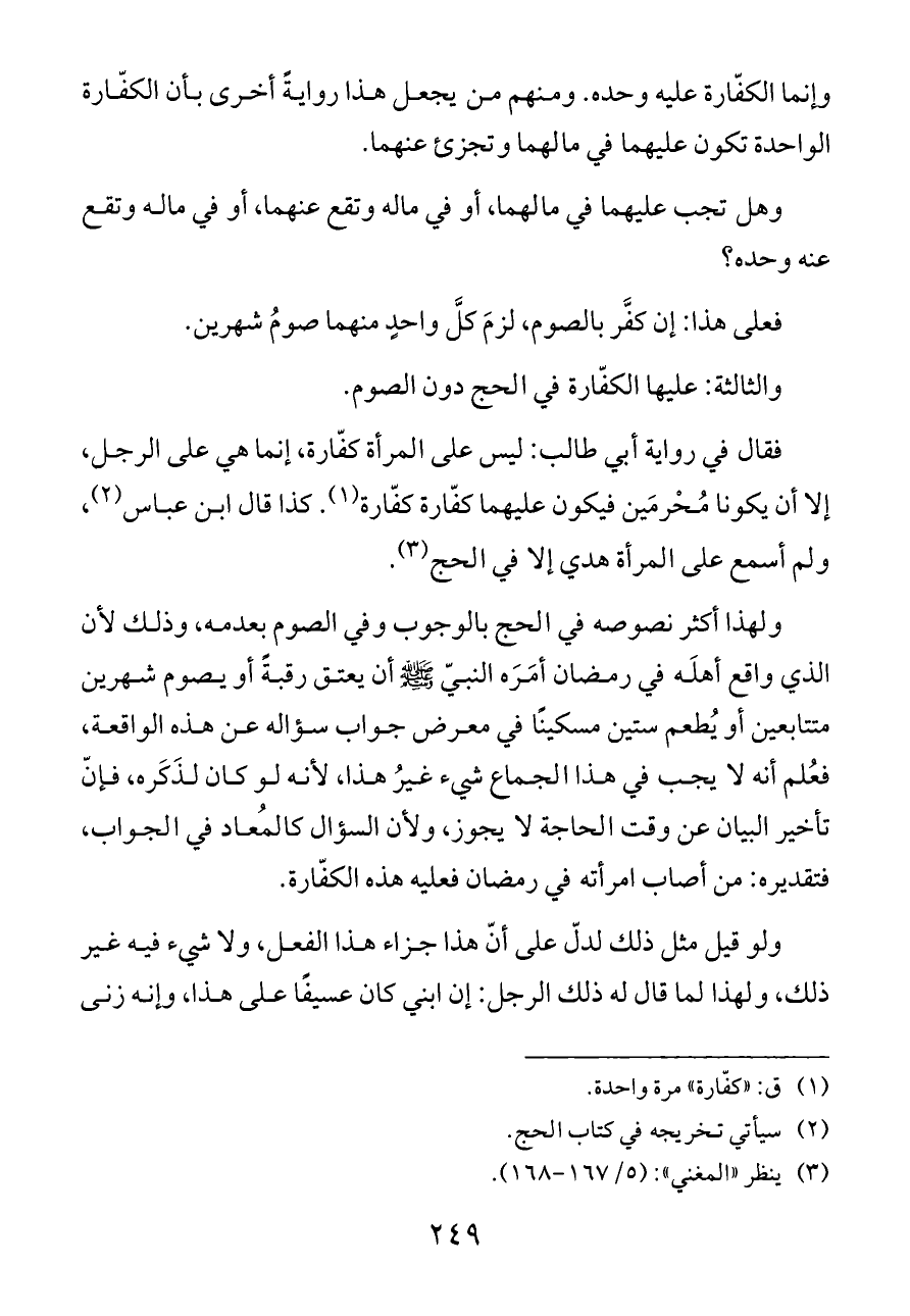 ولهذا أكثر نصوصه في الحج بالوجوب وفي الصوم بعدمه، وذلك لأن الذي واقع أهلَه في رمضان أمَرَه النبيّ - صلى الله عليه وسلم - أن يعتق رقبةً أو يصوم شهرين متتابعين أو يُطعم ستين مسكينًا في معرض جواب سؤاله عن هذه الواقعة، فعُلم أنه لا يجب في هذا الجماع شيء غيرُ هذا، لأنه لو كان لذَكَره، فإنّ تأخير البيان عن وقت الحاجة لا يجوز، ولأن السؤال كالمُعاد في الجواب، فتقديره: من أصاب امرأته في رمضان فعليه هذه الكفّارة.