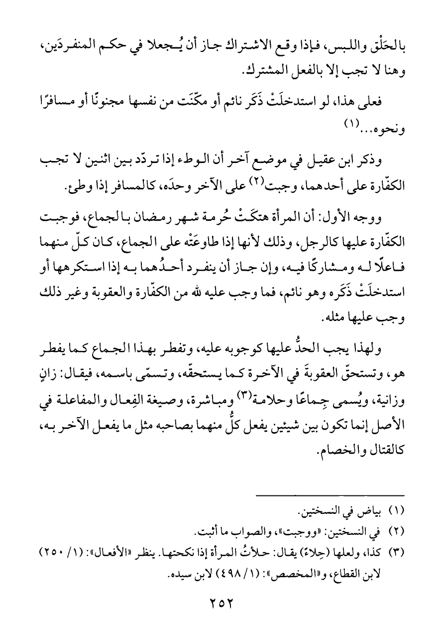 ووجه الأول: أن المرأة هتكَتْ حُرمة شهر رمضان بالجماع، فوجبت الكفّارة عليها كالرجل، وذلك لأنها إذا طاوعَتْه على الجماع، كان كلّ منهما فاعلًا له ومشاركًا فيه، وإن جاز أن ينفرد أحدُهما به إذا استكرهها أو استدخلَتْ ذَكَره وهو نائم، فما وجب عليه لله من الكفّارة والعقوبة وغير ذلك وجب عليها مثله.