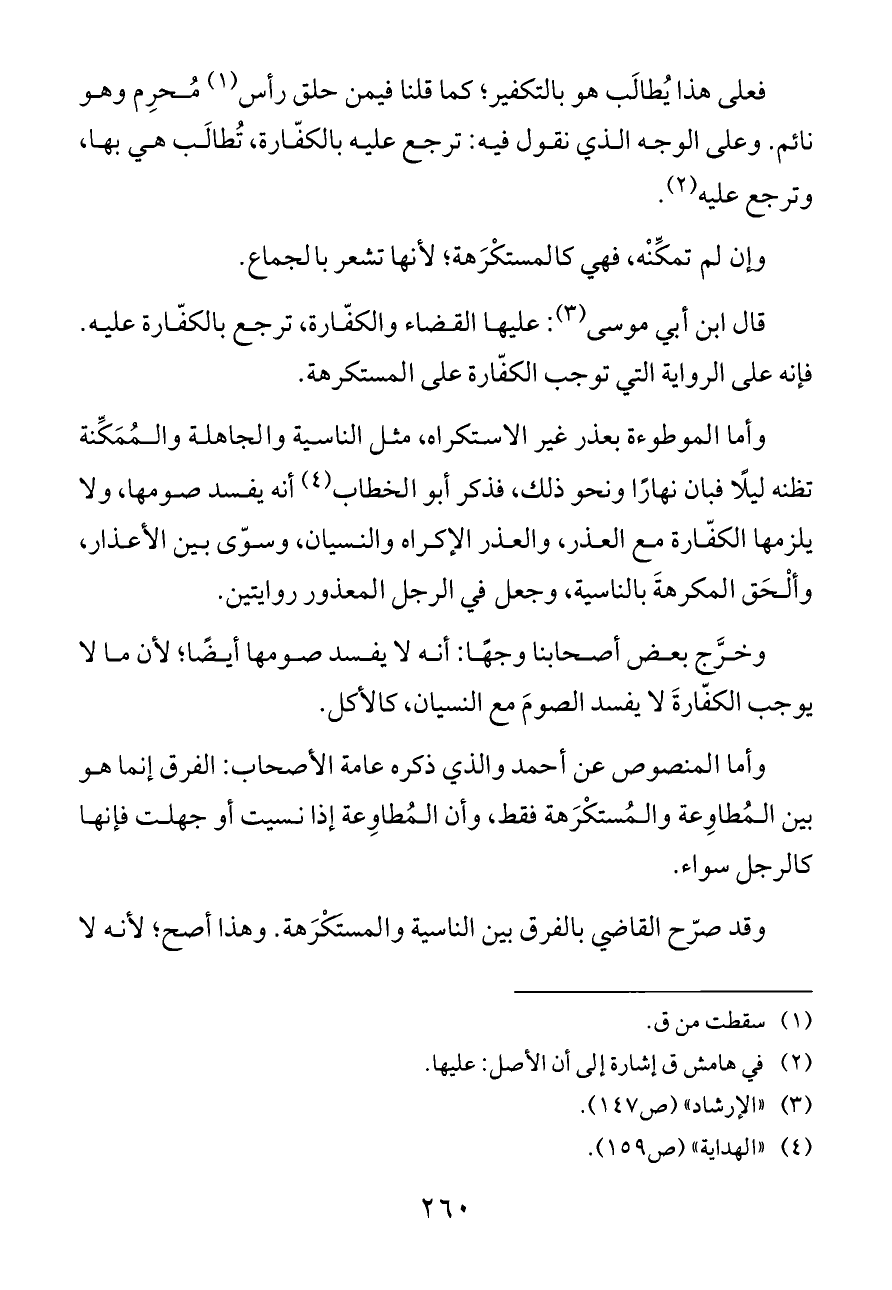 وأما الموطوءة بعذر غير الاستكراه، مثل الناسية والجاهلة والمُمَكِّنة تظنه ليلًا فبان نهارًا ونحو ذلك، فذكر أبو الخطاب (¬٤) أنه يفسد صومها، ولا يلزمها الكفّارة مع العذر، والعذر الإكراه والنسيان، وسوّى بين الأعذار، وألْحَق المكرهةَ بالناسية، وجعل في الرجل المعذور روايتين.