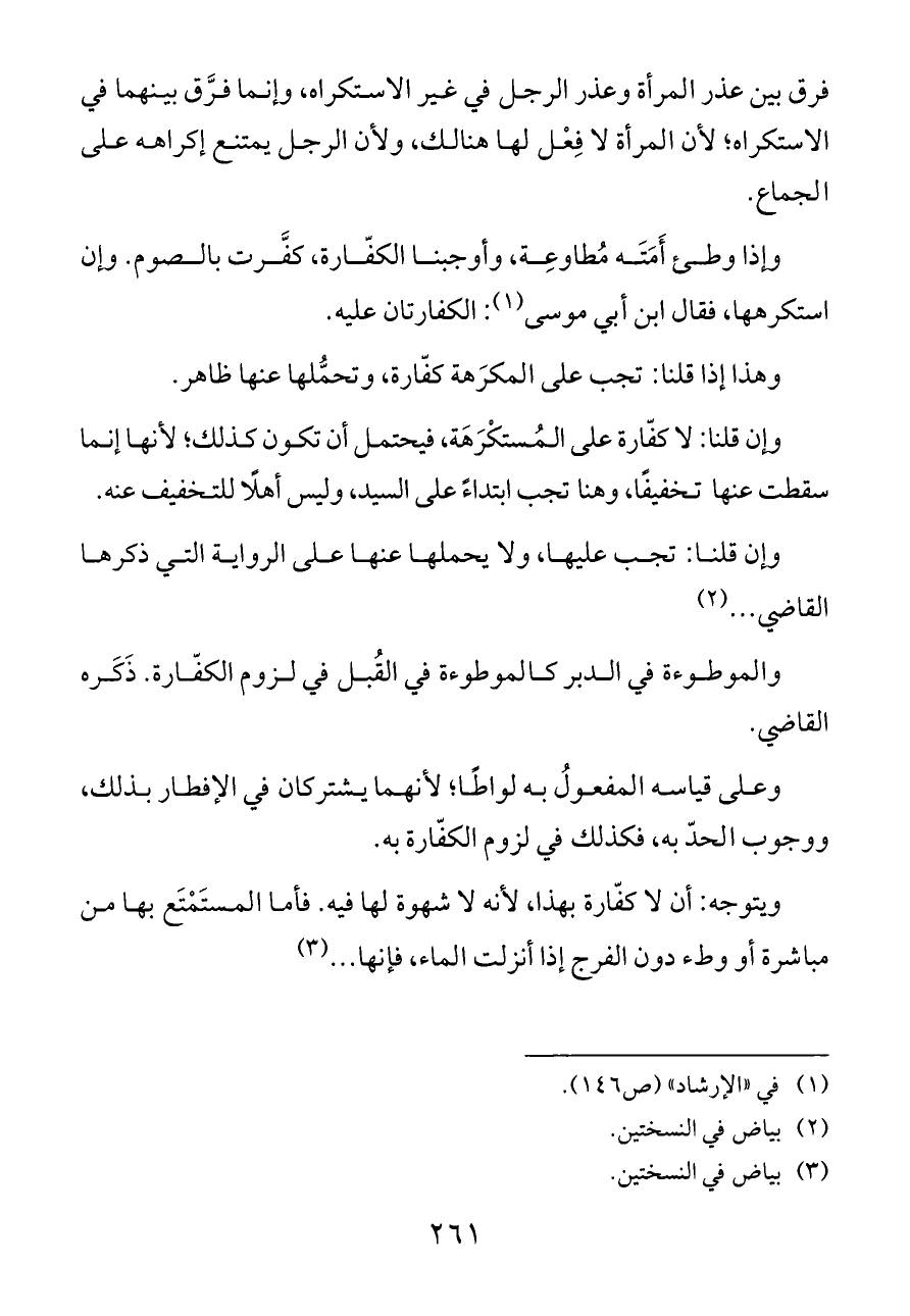 ويتوجه: أن لا كفّارة بهذا، لأنه لا شهوة لها فيه. فأما المستَمْتَع بها من مباشرة أو وطء دون الفرج إذا أنزلت الماء، فإنها ... (¬٣)