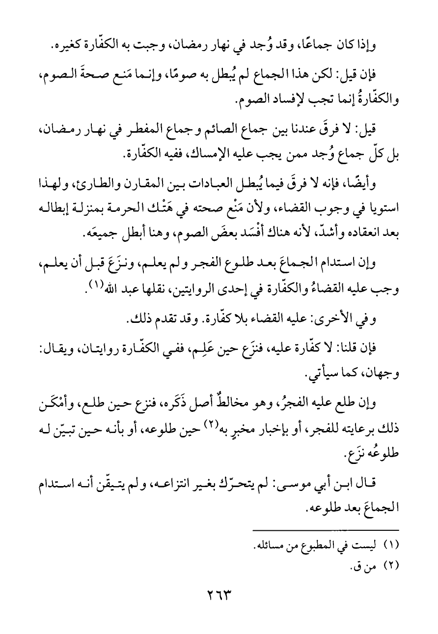 وإن استدام الجماعَ بعد طلوع الفجر ولم يعلم، ونزَعَ قبل أن يعلم، وجب عليه القضاءُ والكفّارة في إحدى الروايتين، نقلها عبد الله (¬١).