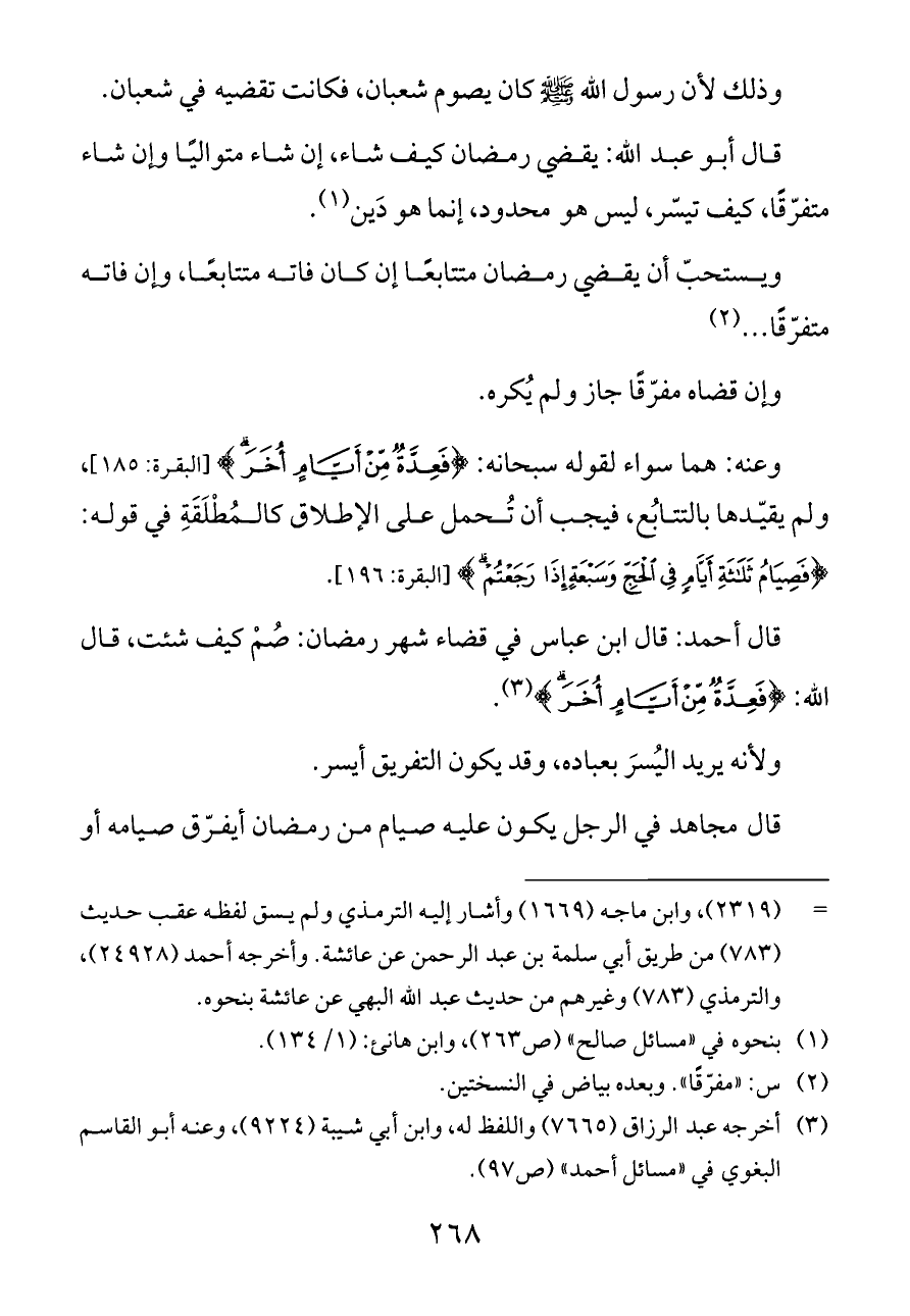قال أحمد: قال ابن عباس في قضاء شهر رمضان: صُمْ كيف شئت، قال الله: {فَعِدَّةٌ مِنْ أَيَّامٍ أُخَرَ} (¬٣).