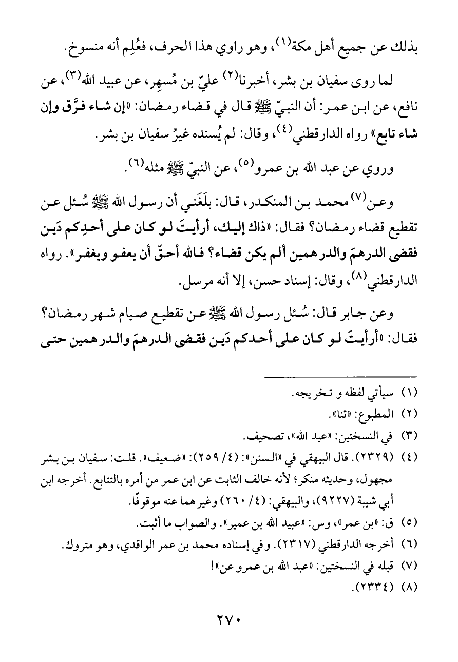 (¬٤). (٢٣٢٩). قال البيهقي في «السنن»: (٤/ ٢٥٩): «ضعيف». قلت: سفيان بن بشر مجهول، وحديثه منكر؛ لأنه خالف الثابت عن ابن عمر من أمره بالتتابع. أخرجه ابن أبي شيبة (٩٢٢٧)، والبيهقي: (٤/ ٢٦٠) وغيرهما عنه موقوفًا.