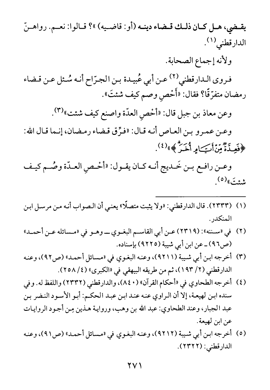 فروى الدارقطني (¬٢) عن أبي عُبيدة بن الجرّاح أنه سُئل عن قضاء رمضان متفرّقًا؟ فقال: «أَحْصِ وصم كيف شئتَ».