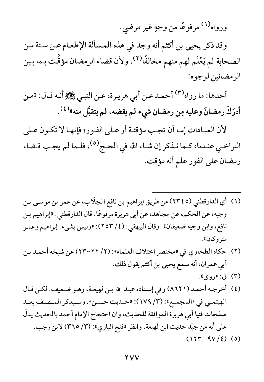 (¬٤). أخرجه أحمد (٨٦٢١) وفي إسناده عبد الله بن لهيعة، وهو ضعيف. لكن قال الهيثمي في «المجمع»: (٣/ ١٧٩): «حديث حسن». وسيذكر المصنف بعد صفحات فتيا أبي هريرة الموافقة للحديث، وأن احتجاج الإمام أحمد بالحديث يدلّ على أنه من جيّد حديث ابن لهيعة. وانظر «فتح الباري»: (٣/ ٣٦٥) لابن رجب.
