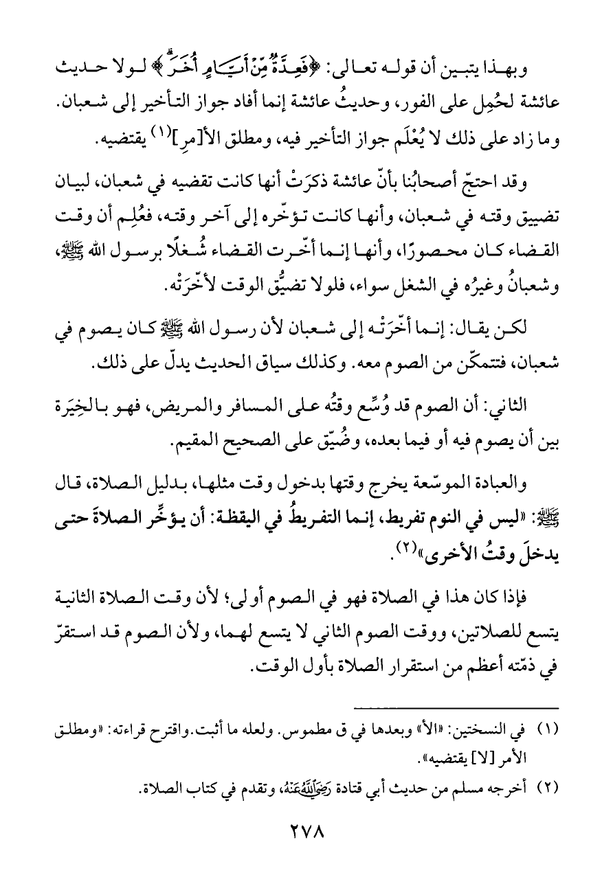 وبهذا يتبين أن قوله تعالى: {فَعِدَّةٌ مِنْ أَيَّامٍ أُخَرَ} لولا حديث عائشة لحُمِل على الفور، وحديثُ عائشة إنما أفاد جواز التأخير إلى شعبان. وما زاد على ذلك لا يُعْلَم جواز التأخير فيه، ومطلق الأ [مرِ] (¬١) يقتضيه.