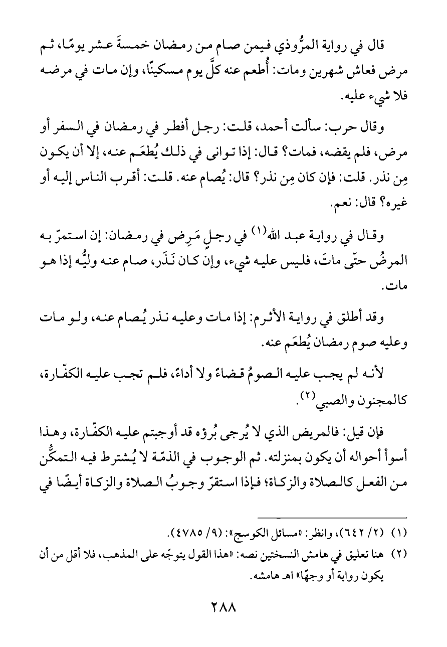 وقال حرب: سألت أحمد، قلت: رجل أفطر في رمضان في السفر أو مرض، فلم يقضه، فمات؟ قال: إذا توانى في ذلك يُطعَم عنه، إلا أن يكون مِن نذر. قلت: فإن كان مِن نذر؟ قال: يُصام عنه. قلت: أقرب الناس إليه أو غيره؟ قال: نعم.