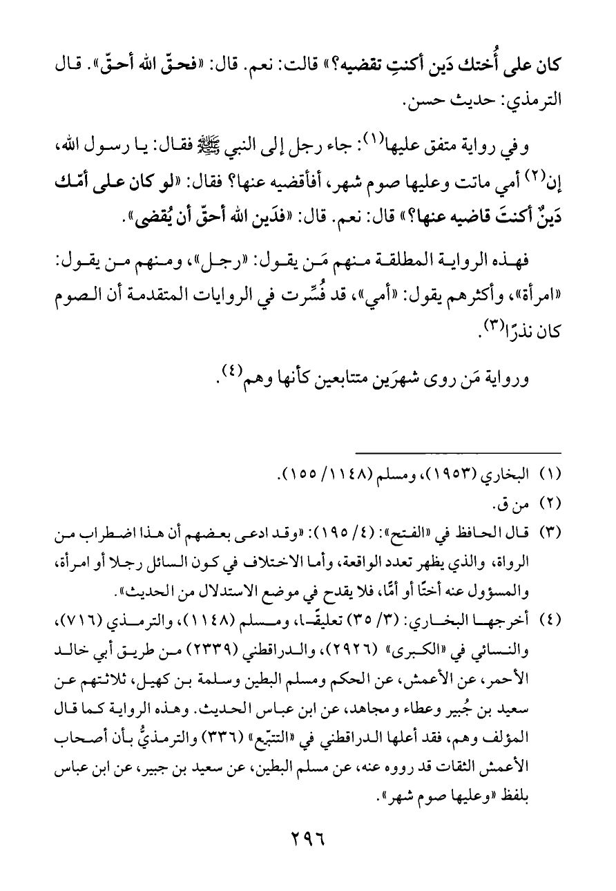 فهذه الرواية المطلقة منهم مَن يقول: «رجل»، ومنهم من يقول: «امرأة»، وأكثرهم يقول: «أمي»، قد فُسِّرت في الروايات المتقدمة أن الصوم كان نذرًا (¬٣).