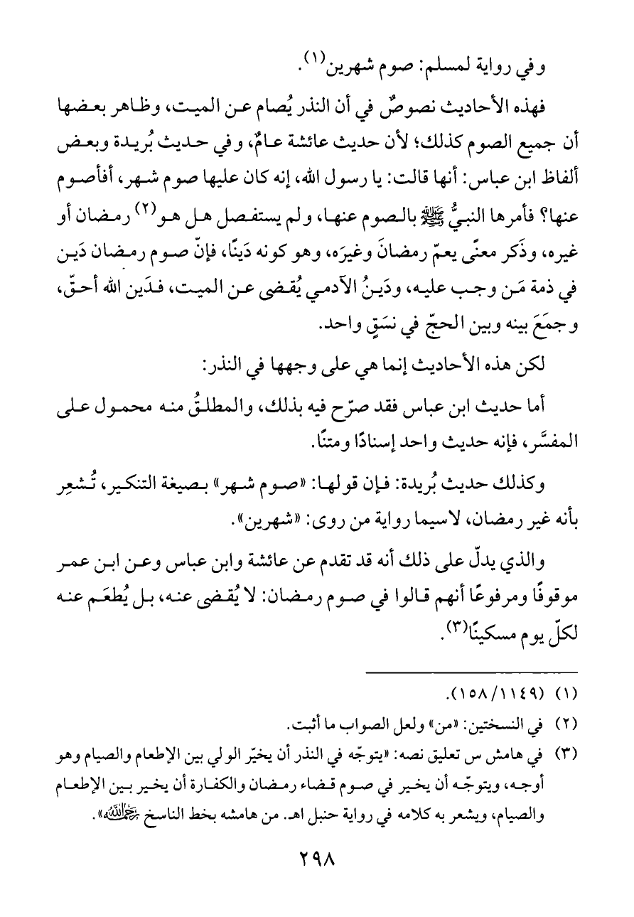 (¬٣). في هامش س تعليق نصه: «يتوجّه في النذر أن يخيّر الولي بين الإطعام والصيام وهو أوجه، ويتوجّه أن يخير في صوم قضاء رمضان والكفارة أن يخير بين الإطعام والصيام، ويشعر به كلامه في رواية حنبل اهـ. من هامشه بخط الناسخ - رحمه الله -».
