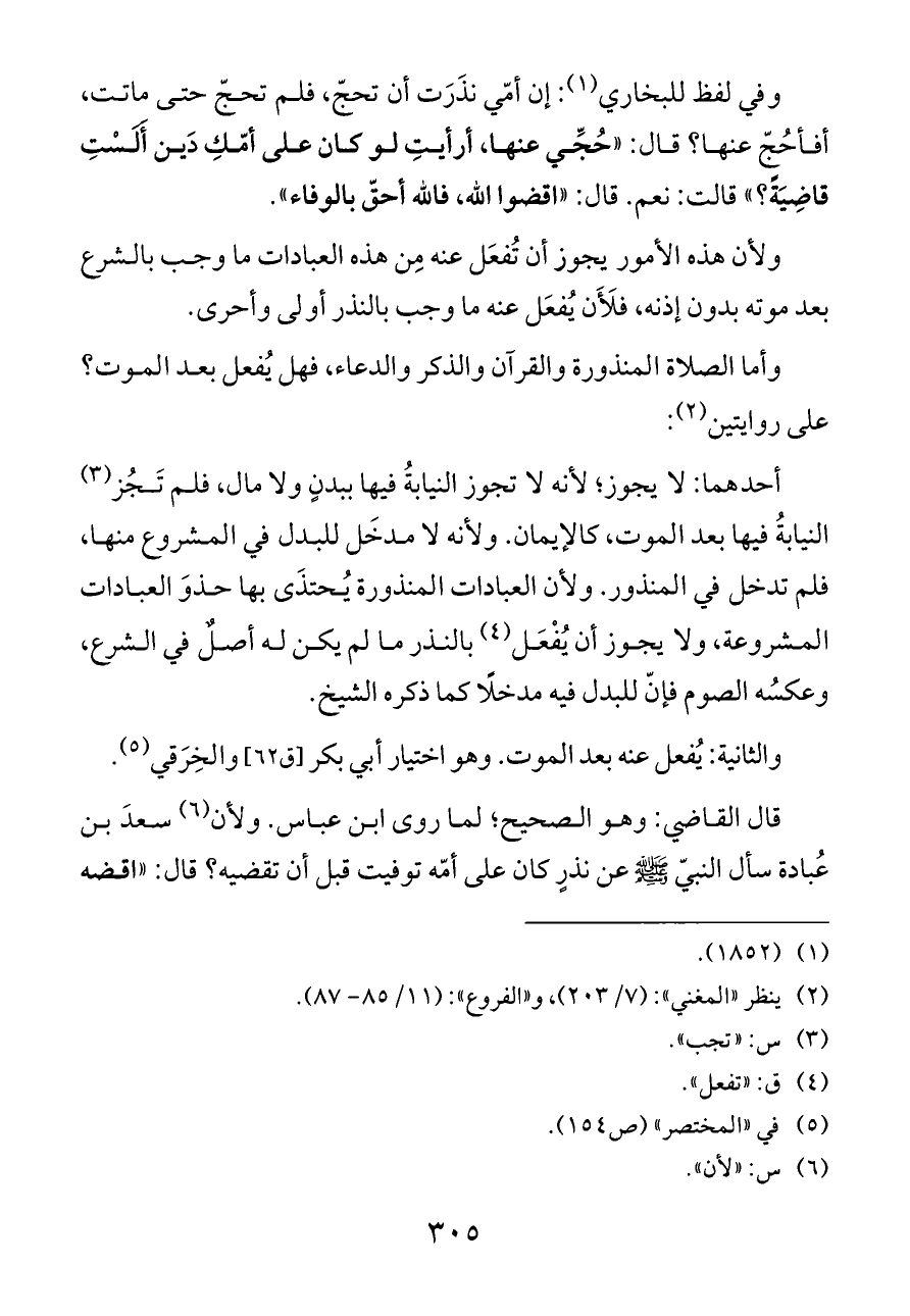 وأما الصلاة المنذورة والقرآن والذكر والدعاء، فهل يُفعل بعد الموت؟ على روايتين (¬٢):