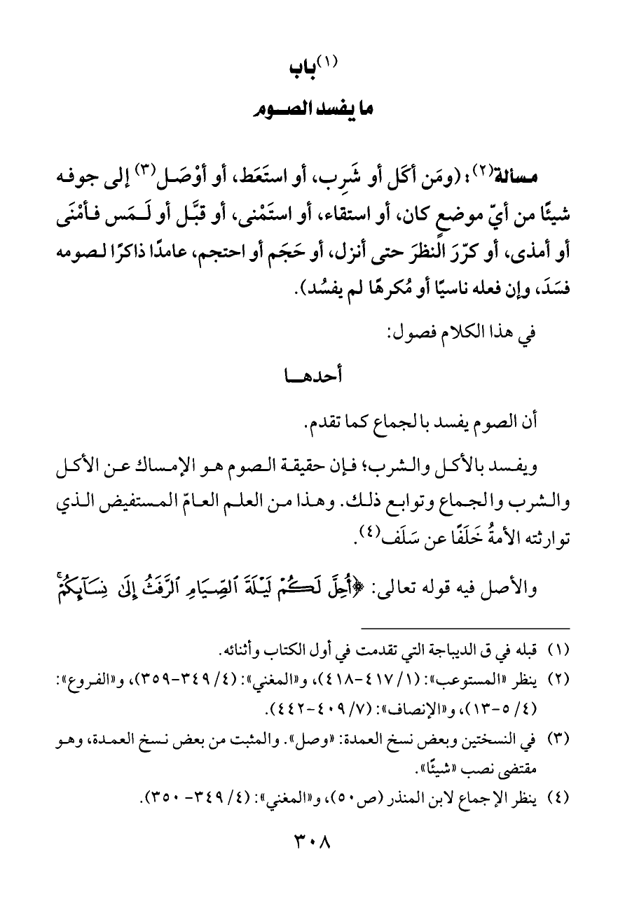 مسألة (¬٢): (ومَن أكَل أو شَرِب، أو استَعَط، أو أوْصَل (¬٣) إلى جوفه شيئًا من أيّ موضعٍ كان، أو استقاء، أو استَمْنى، أو قبَّل أو لَمَس فأمْنَى أو أمذى، أو كرّرَ النظرَ حتى أنزل، أو حَجَم أو احتجم، عامدًا ذاكرًا لصومه فسَدَ، وإن فعله ناسيًا أو مُكرهًا لم يفسُد).