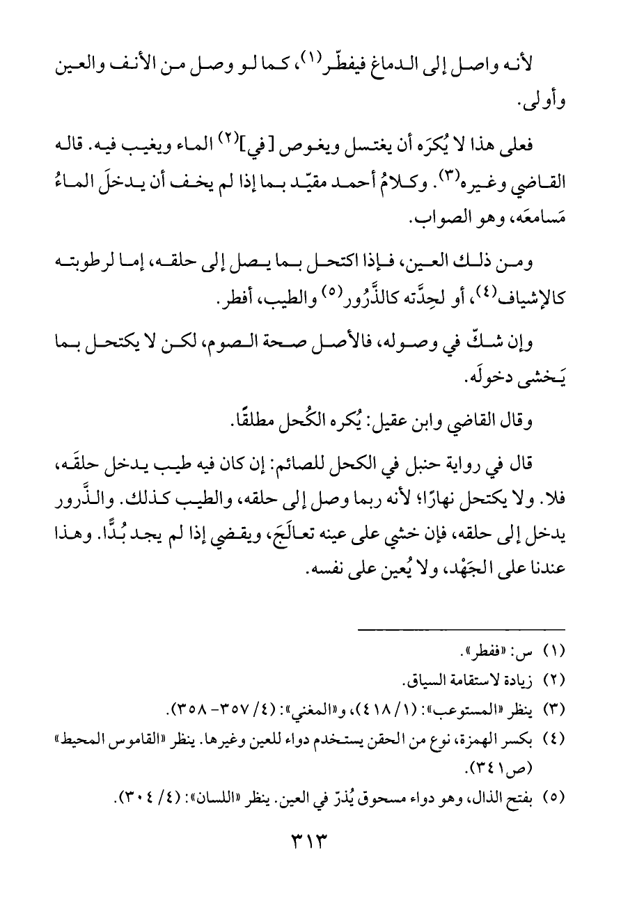 قال في رواية حنبل في الكحل للصائم: إن كان فيه طيب يدخل حلقَه، فلا. ولا يكتحل نهارًا؛ لأنه ربما وصل إلى حلقه، والطيب كذلك. والذَّرور يدخل إلى حلقه، فإن خشي على عينه تعالَجَ، ويقضي إذا لم يجد بُدًّا. وهذا عندنا على الجَهْد، ولا يُعين على نفسه.