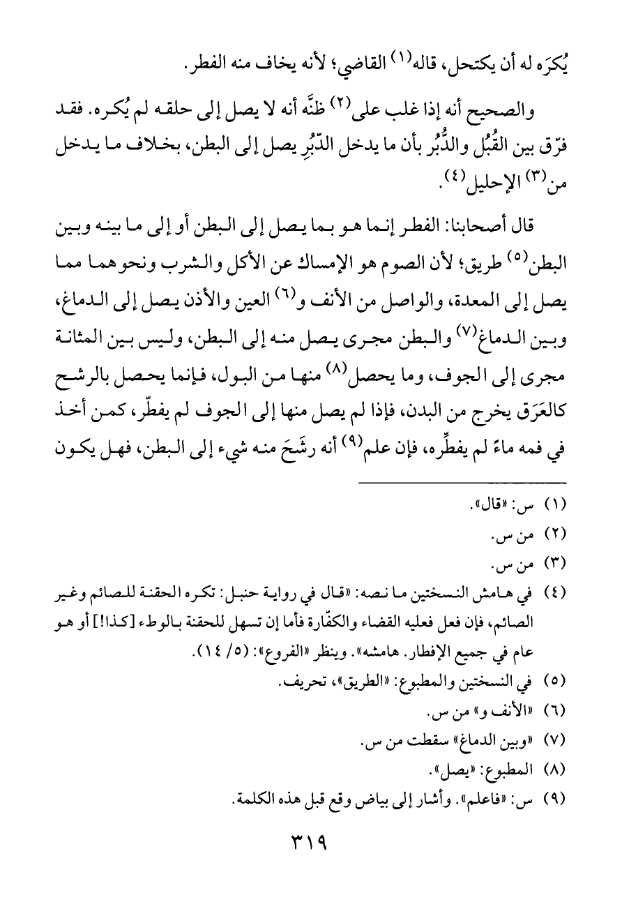 (¬٤). في هامش النسختين ما نصه: «قال في رواية حنبل: تكره الحقنة للصائم وغير الصائم، فإن فعل فعليه القضاء والكفّارة فأما إن تسهل للحقنة بالوطء [كذا!] أو هو عام في جميع الإفطار. هامشه». وينظر «الفروع»: (٥/ ١٤).