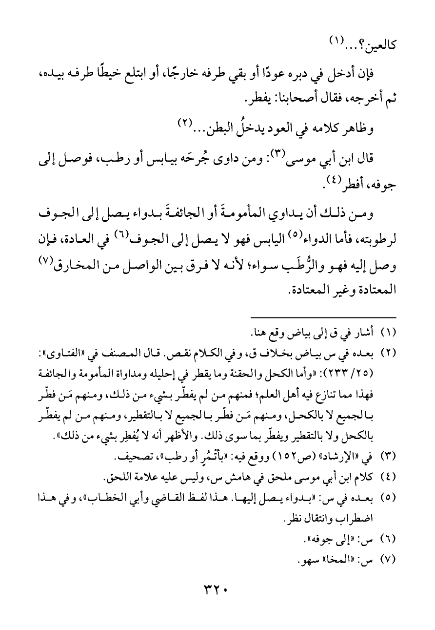 (¬٢). بعده في س بياض بخلاف ق، وفي الكلام نقص. قال المصنف في «الفتاوى»: (٢٥/ ٢٣٣): «وأما الكحل والحقنة وما يقطر في إحليله ومداواة المأمومة والجائفة فهذا مما تنازع فيه أهل العلم؛ فمنهم من لم يفطّر بشيء من ذلك، ومنهم مَن فطّر بالجميع لا بالكحل، ومنهم مَن فطّر بالجميع لا بالتقطير، ومنهم من لم يفطّر بالكحل ولا بالتقطير ويفطّر بما سوى ذلك. والأظهر أنه لا يُفطِر بشيء من ذلك».