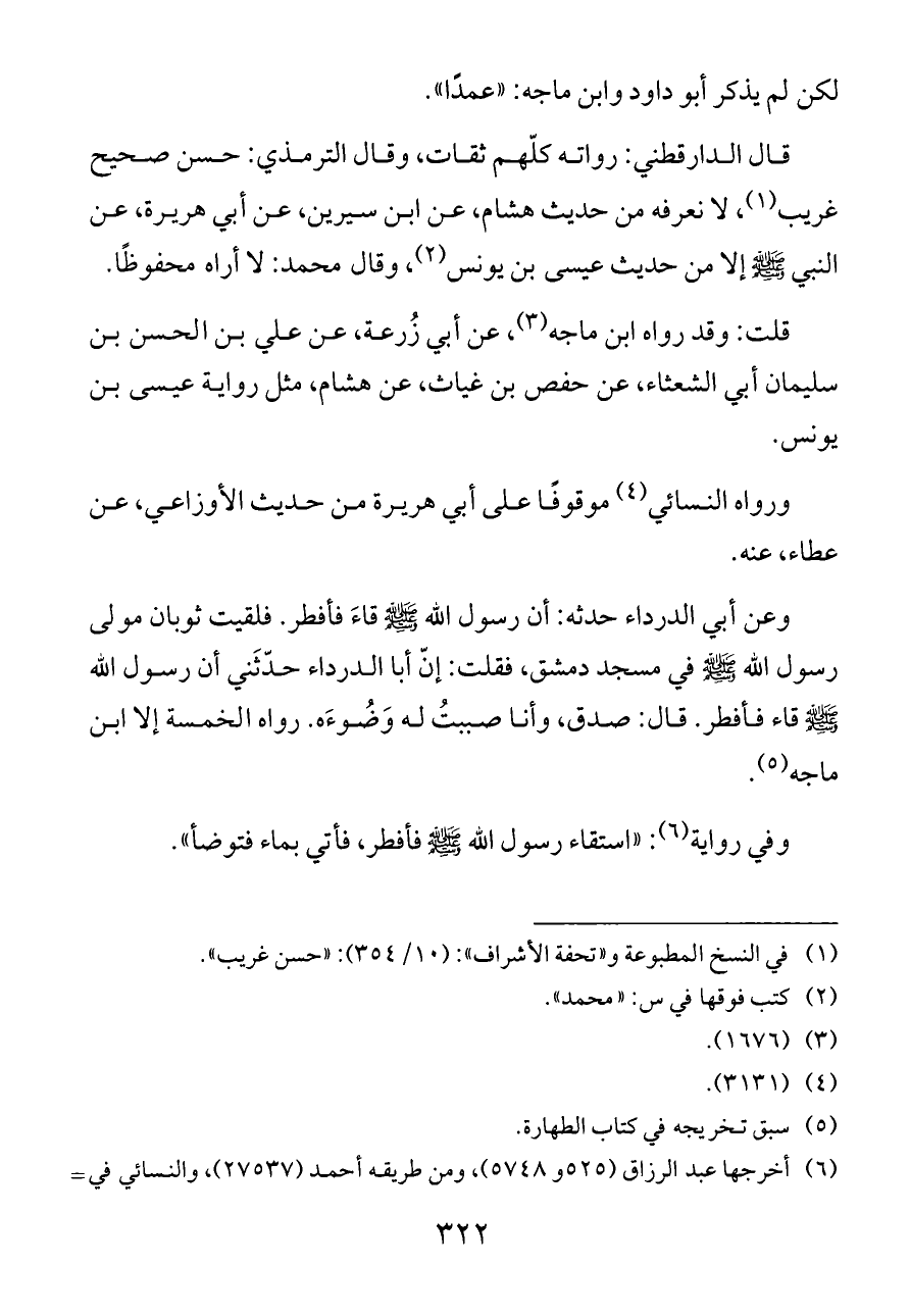 قال الدارقطني: رواته كلّهم ثقات، وقال الترمذي: حسن صحيح غريب (¬١)، لا نعرفه من حديث هشام، عن ابن سيرين، عن أبي هريرة، عن النبي - صلى الله عليه وسلم - إلا من حديث عيسى بن يونس (¬٢)، وقال محمد: لا أراه محفوظًا.