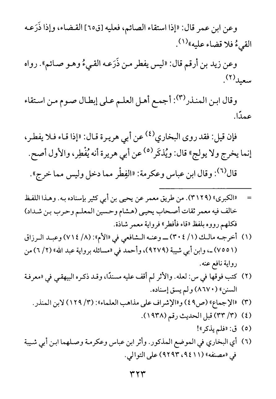 وعن زيد بن أرقم قال: «ليس يفطر من ذَرَعه القيءُ وهو صائم». رواه سعيد (¬٢).