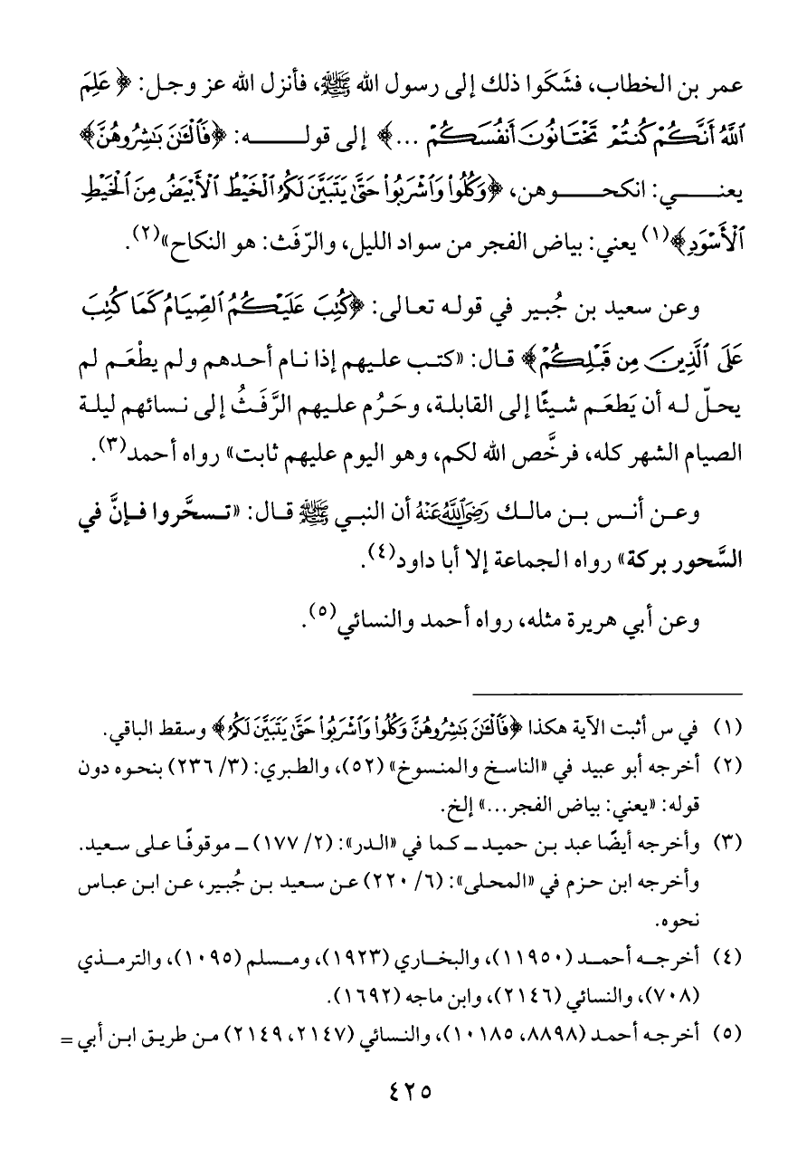وعن سعيد بن جُبير في قوله تعالى: {كُتِبَ عَلَيْكُمُ الصِّيَامُ كَمَا كُتِبَ عَلَى الَّذِينَ مِنْ قَبْلِكُمْ} قال: «كتب عليهم إذا نام أحدهم ولم يطْعَم لم يحلّ له أن يَطعَم شيئًا إلى القابلة، وحَرُم عليهم الرَّفَثُ إلى نسائهم ليلة الصيام الشهر كله، فرخَّص الله لكم، وهو اليوم عليهم ثابت» رواه أحمد (¬٣).