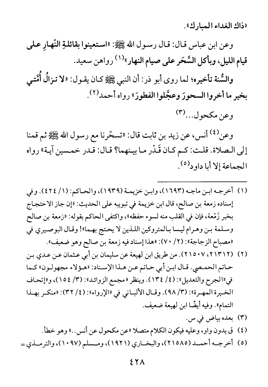 وعن ابن عباس قال: قال رسول الله - صلى الله عليه وسلم -: «استعينوا بقائلةِ النّهارِ على قيام الليل، وبأكل السَّحَر على صيام النهار» (¬١) رواهن سعيد.