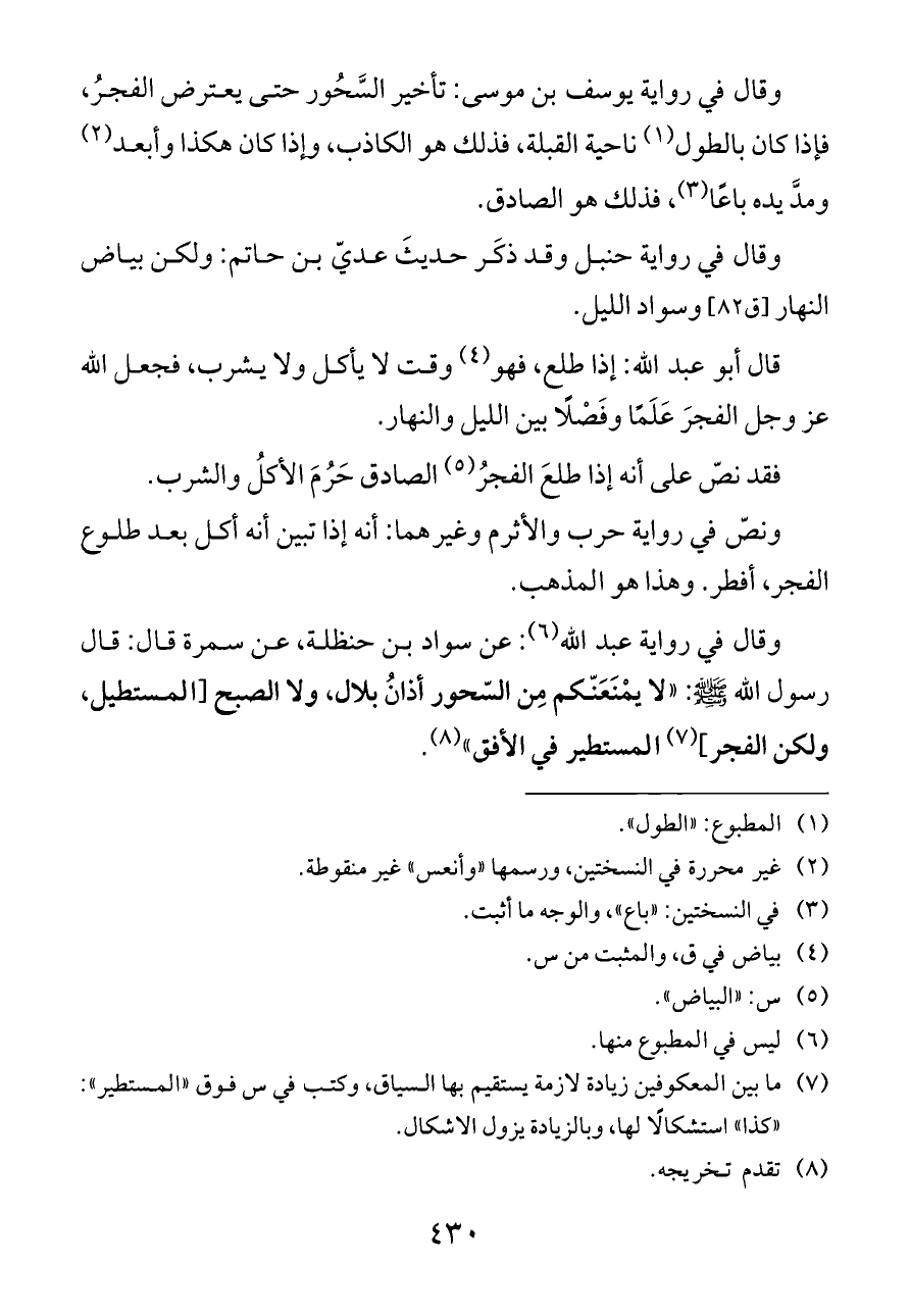 وقال في رواية يوسف بن موسى: تأخير السَّحُور حتى يعترض الفجرُ، فإذا كان بالطول (¬١) ناحية القبلة، فذلك هو الكاذب، وإذا كان هكذا وأبعد (¬٢) ومدَّ يده باعًا (¬٣)، فذلك هو الصادق.