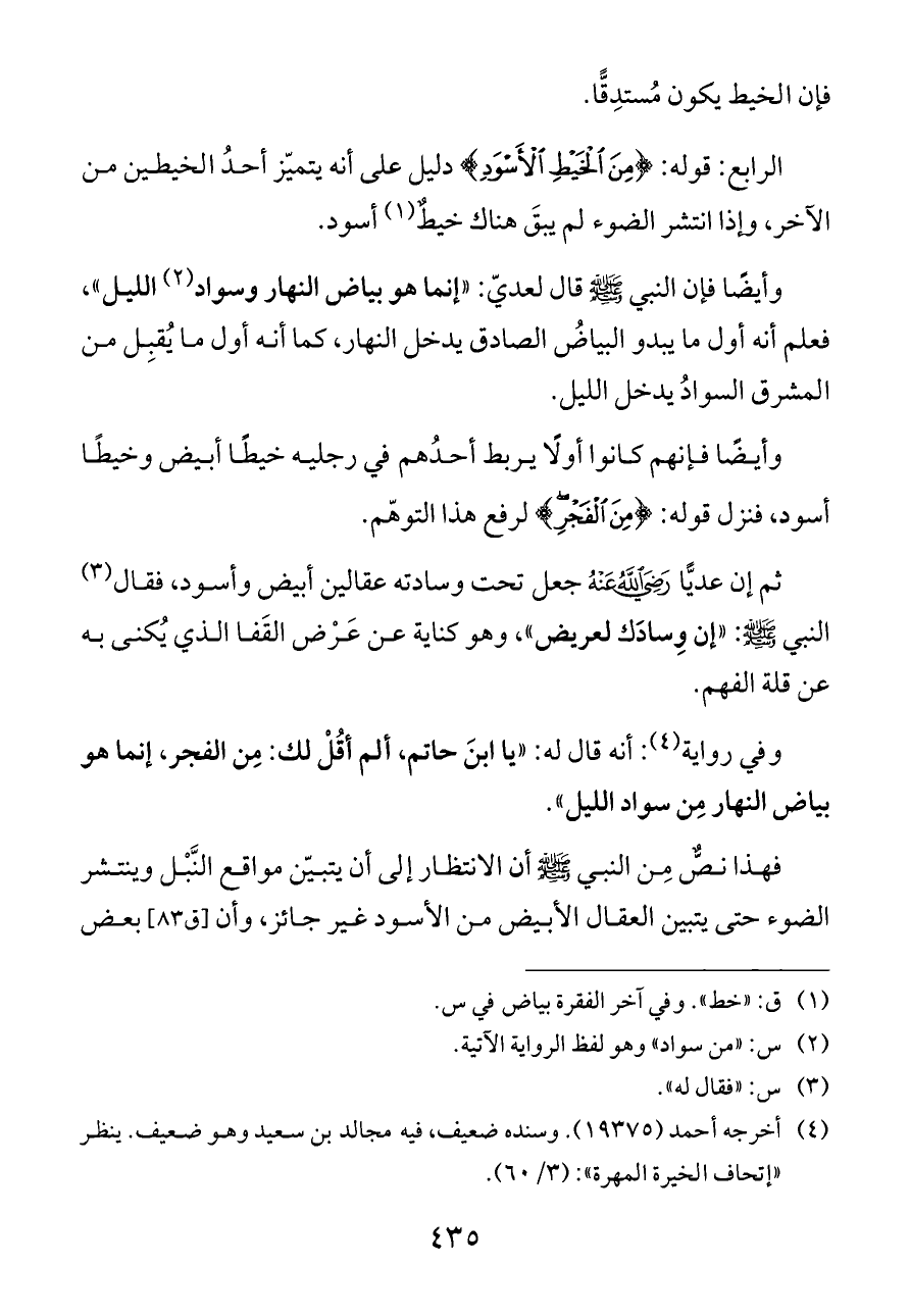 وفي رواية (¬٤): أنه قال له: «يا ابنَ حاتم، ألم أقُلْ لك: مِن الفجر، إنما هو بياض النهار مِن سواد الليل».