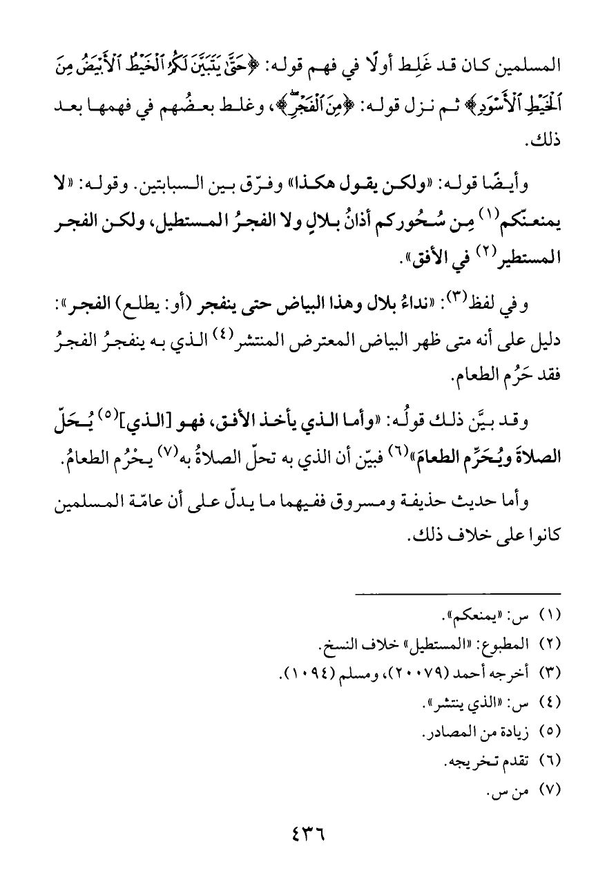 وقد بيَّن ذلك قولُه: «وأما الذي يأخذ الأفق، فهو [الذي] (¬٥) يُحَلّ الصلاةَ ويُحَرِّم الطعامَ» (¬٦) فبيّن أن الذي به تحلّ الصلاةُ به (¬٧) يحْرُم الطعامُ.