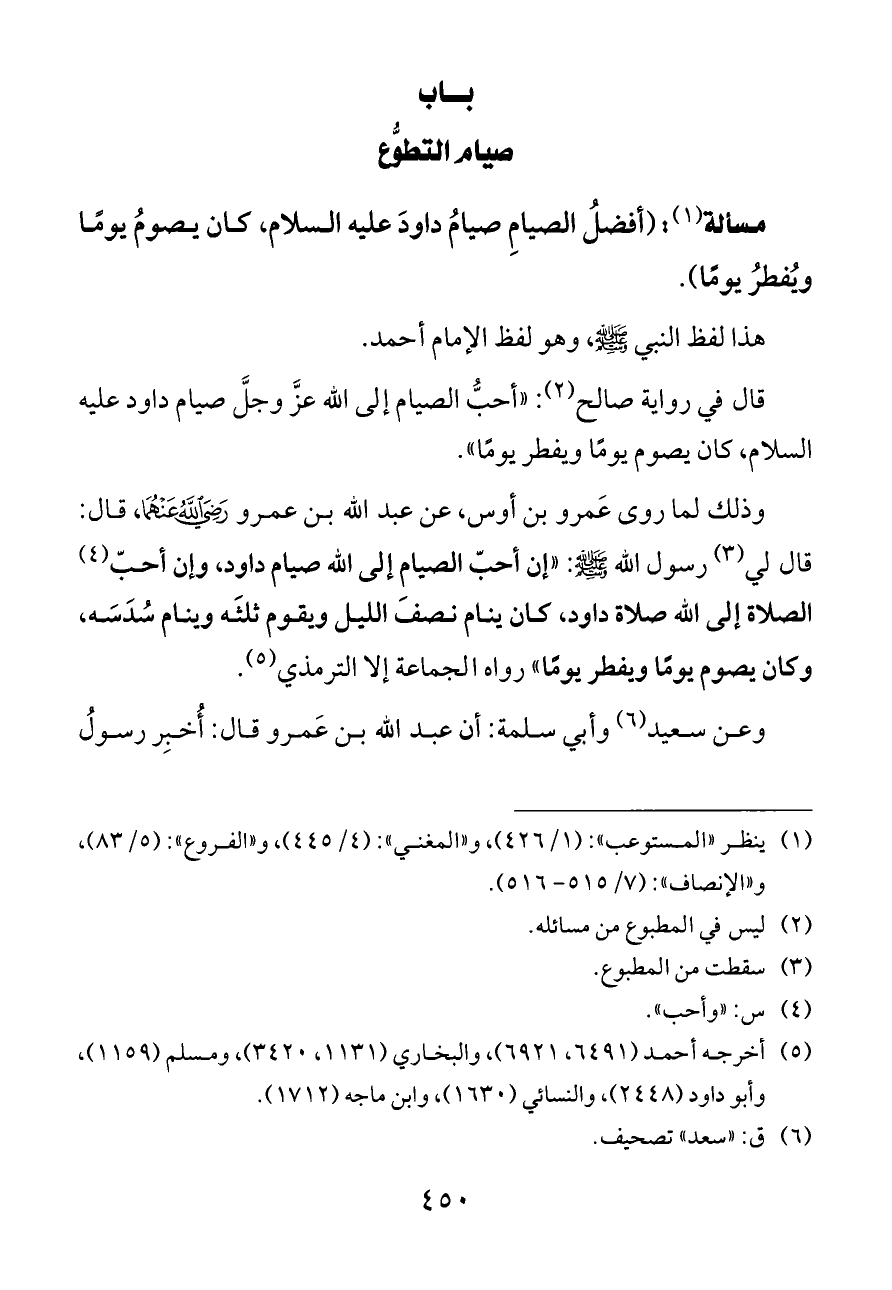 وذلك لما روى عَمرو بن أوس، عن عبد الله بن عمرو - رضي الله عنهما -، قال: قال لي (¬٣) رسول الله - صلى الله عليه وسلم -: «إن أحبّ الصيام إلى الله صيام داود، وإن أحبّ (¬٤) الصلاة إلى الله صلاة داود، كان ينام نصفَ الليل ويقوم ثلثَه وينام سُدَسَه، وكان يصوم يومًا ويفطر يومًا» رواه الجماعة إلا الترمذي (¬٥).