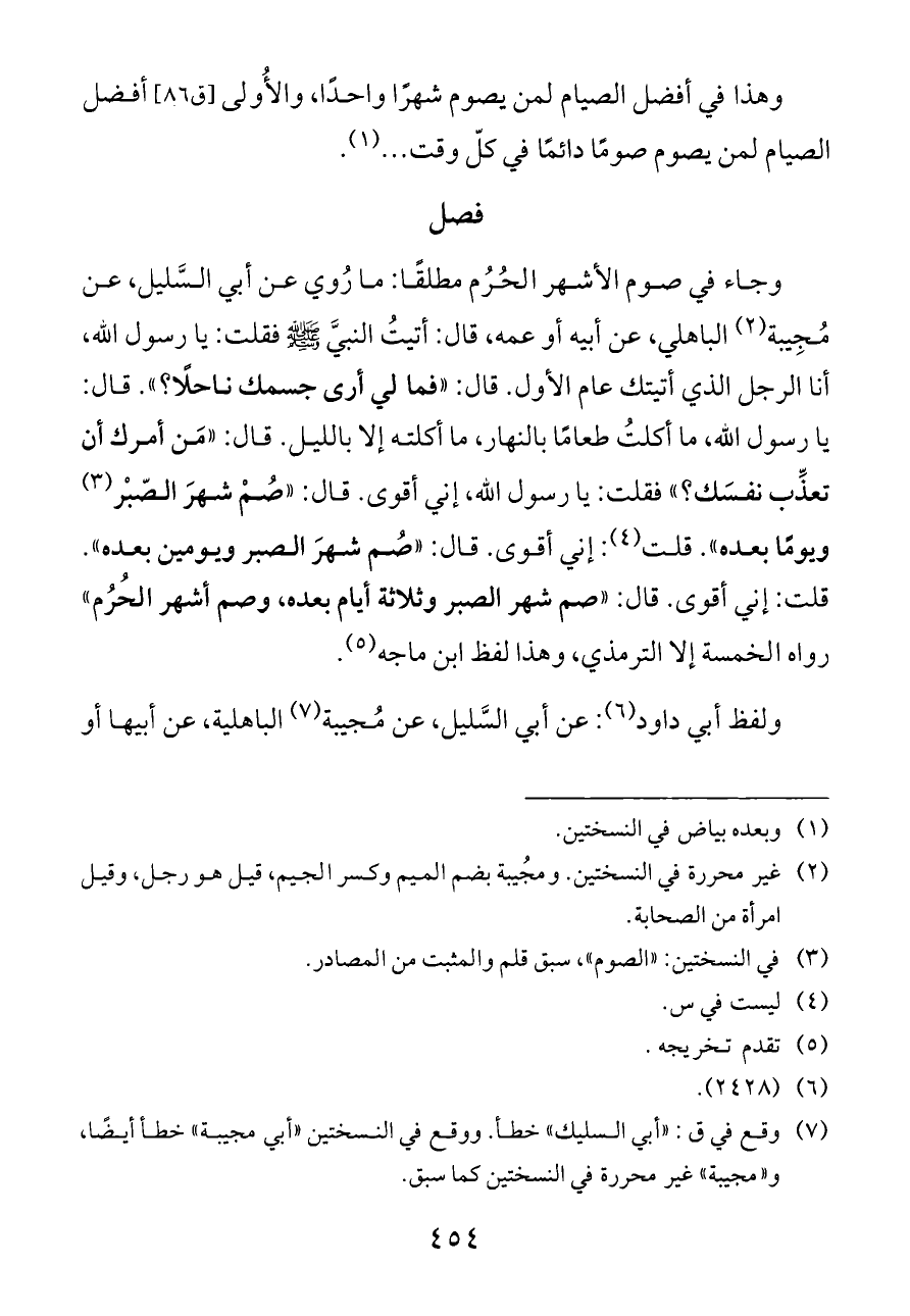 وجاء في صوم الأشهر الحُرُم مطلقًا: ما رُوي عن أبي السَّليل، عن مُجِيبة (¬٢) الباهلي، عن أبيه أو عمه، قال: أتيتُ النبيَّ - صلى الله عليه وسلم - فقلت: يا رسول الله، أنا الرجل الذي أتيتك عام الأول. قال: «فما لي أرى جسمك ناحلًا؟». قال: يا رسول الله، ما أكلتُ طعامًا بالنهار، ما أكلته إلا بالليل. قال: «مَن أمرك أن تعذِّب نفسَك؟» فقلت: يا رسول الله، إني أقوى. قال: «صُمْ شهرَ الصّبْر (¬٣) ويومًا بعده». قلت (¬٤): إني أقوى. قال: «صُم شهرَ الصبر ويومين بعده». قلت: إني أقوى. قال: «صم شهر الصبر وثلاثة أيام بعده، وصم أشهر الحُرُم» رواه الخمسة إلا الترمذي، وهذا لفظ ابن ماجه (¬٥).