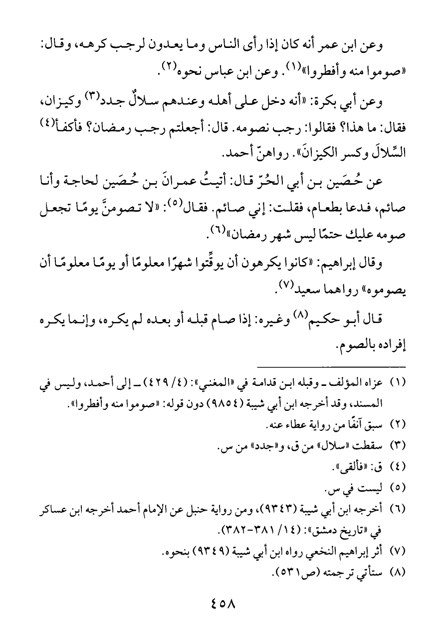 وعن ابن عمر أنه كان إذا رأى الناس وما يعدون لرجب كرهه، وقال: «صوموا منه وأفطروا» (¬١). وعن ابن عباس نحوه (¬٢).