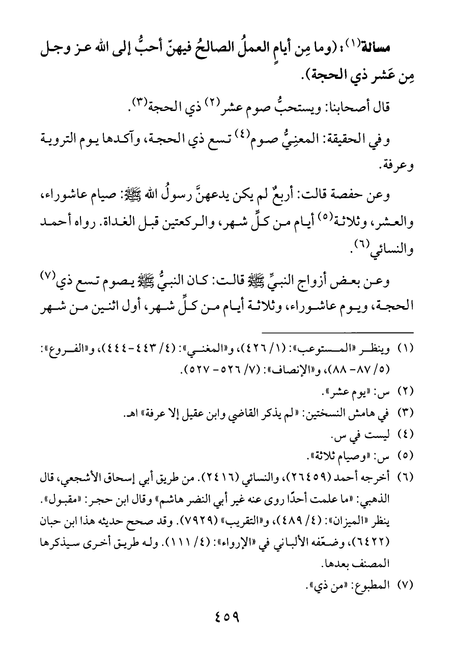 مسألة (¬١): (وما مِن أيامٍ العملُ الصالحُ فيهنّ أحبُّ إلى الله عز وجل مِن عَشر ذي الحجة).