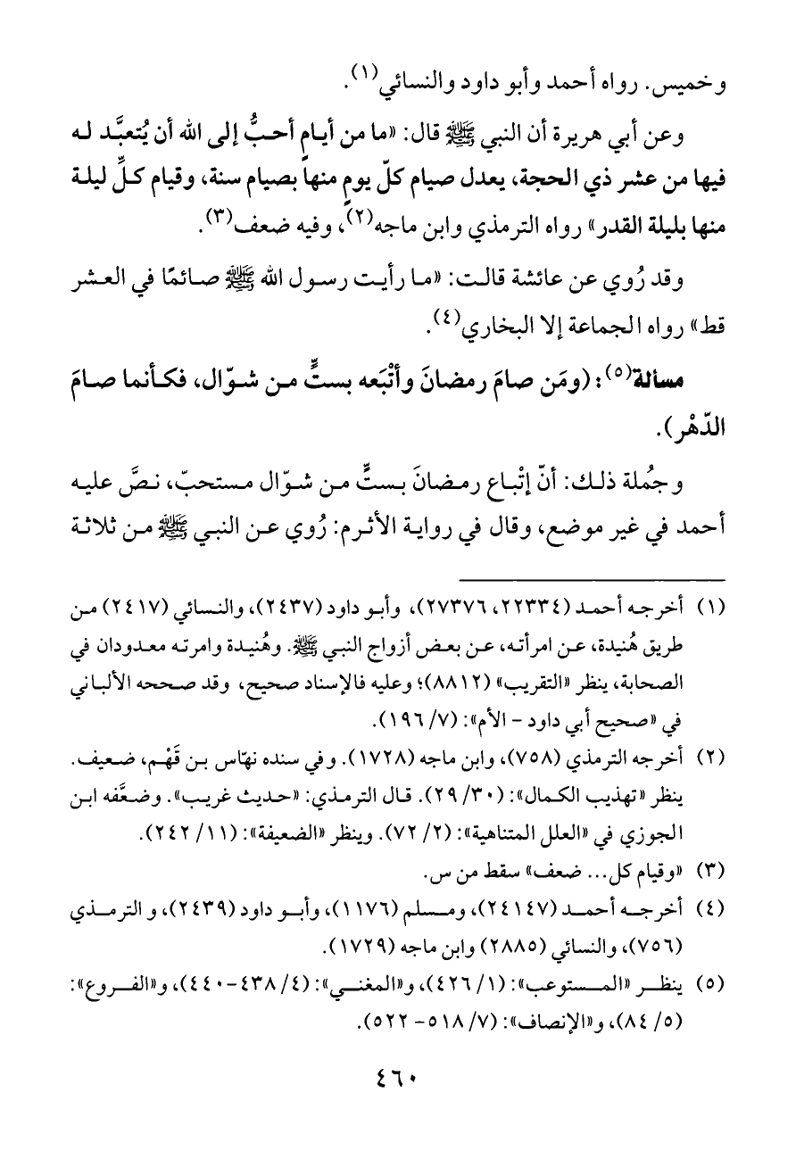 وعن أبي هريرة أن النبي - صلى الله عليه وسلم - قال: «ما من أيامٍ أحبُّ إلى الله أن يُتعبَّد له فيها من عشر ذي الحجة، يعدل صيام كلّ يومٍ منها بصيام سنة، وقيام كلِّ ليلة منها بليلة القدر» رواه الترمذي وابن ماجه (¬٢)، وفيه ضعف (¬٣).