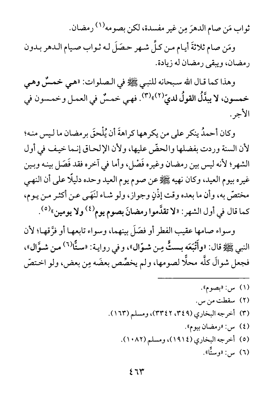 وكان أحمدُ ينكر على من يكرهها كراهةَ أن يُلْحقَ برمضان ما ليس منه؛ لأن السنة وردت بفضلها والحضّ عليها، ولأن الإلحاق إنما خيف في أول الشهر؛ لأنه ليس بين رمضان وغيره فَصْل، وأما في آخره فقد فَصَل بينه وبين غيره بيوم العيد، وكان نهيه - صلى الله عليه وسلم - عن صوم يوم العيد وحده دليلًا على أن النهي مختصّ به، وأن ما بعده وقت إذْنٍ وجواز، ولو شاء لنَهَى عن أكثر من يوم، كما قال في أول الشهر: «لا تقدَّموا رمضانَ بصوم يوم (¬٤) ولا يومين» (¬٥).